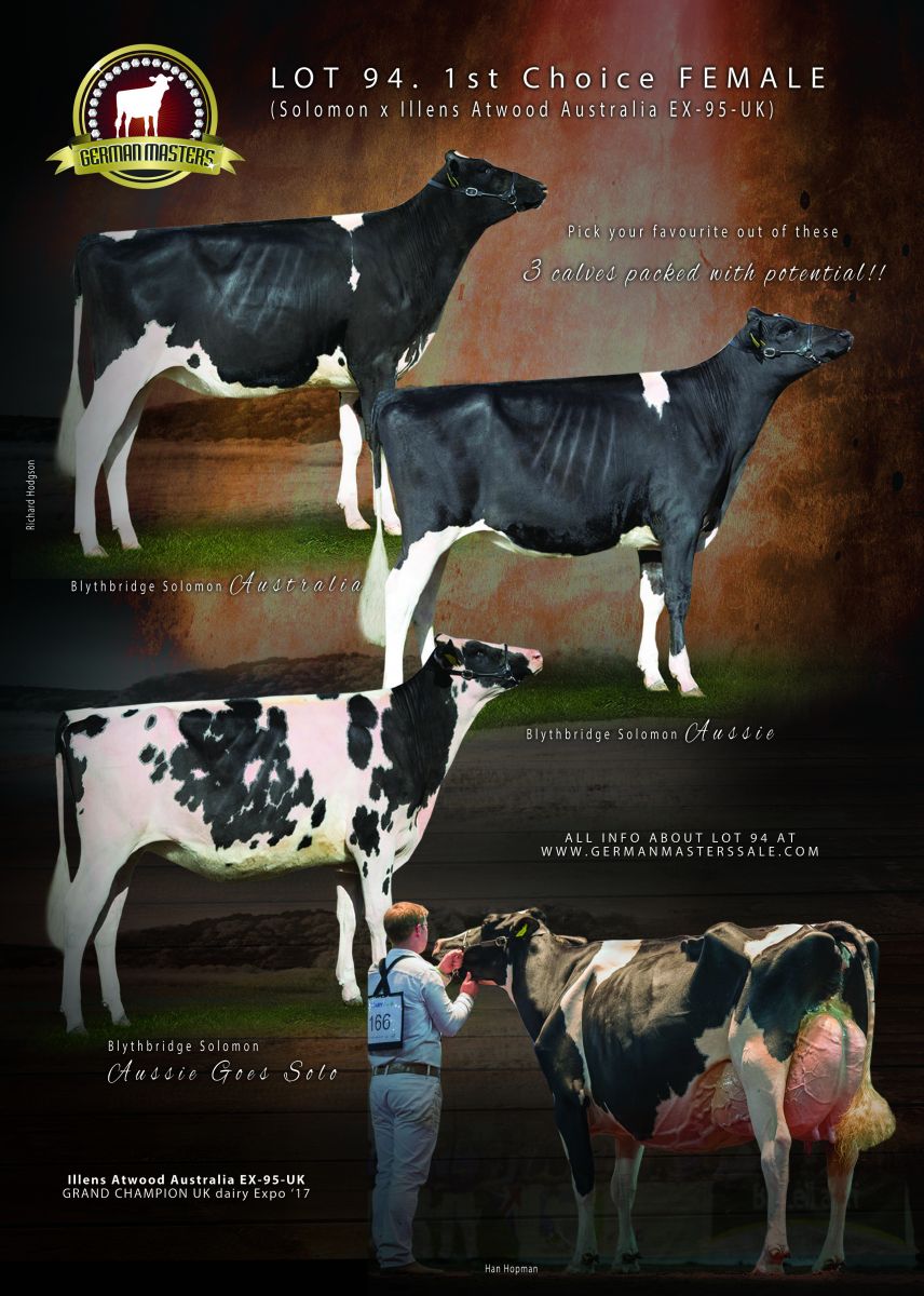 The Holstein breed has a new EX-95 point cow, it's one of the greatest cows ever walked through the European show rings, Illens Atwood Australia which just received the EX-95 points score in the UK, where she won recently the GRAND CHAMPIONSHIP at the National Show the UK Dairy Day '17!! Great opportunity of her sells in the German Masters Sale, Lot 94 with a 1st Choice of 3 incredible Solomon daughters ouf of her, which are October & November '16 born, so ready to flush and show! Click further for their pictures!