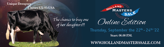 The first pictures of the calves and heifers are now ONLINE from the Online Tag+ Holland Masters Sale 2022! Teak a seat an look at these stunning sale calves and heifers! This sale offers the very best heifers, fresh cows and embryos from amazing families, like: Bons-Holsteins Koba 219 EX-94-NL EX-95-MS, Unique Dempsey Cheers EX-95-USA, Arethusa Sid Tess EX-92-USA, De Oosterhof DG Rose VG-89-NL EX-MS, All-Star Jotan Bella EX-92-DE, Our-Favorite Unlimited EX-94-USA and many more! Stay tuned at hollandmasterssale.com for more info about this super sale coming up!!
