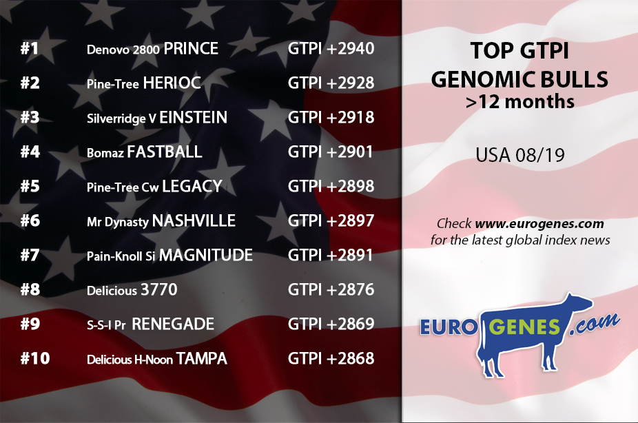 Prince did it again!! He is the #1 GTPI Genomic bull in the August '19 index run. He notes +2940 GTPI in combination with +1094 NM$. He is followed by the former and currently number 2: Pine-Tree Heroic with +2928 GTPI. New in the top 5 is Bomaz Fastball a Topnotch son with +2901 GTPI. The #1 Genomic NET MERIT bull is the #2 GTPI bull: Pine-Tree Herioc with +1160 NM$!!! Prince claims the second position with +1094 NM$. Legacy keeps impressing with +1090 NM$ at place 3. The #1 GTPI daughter proven bull in the breed is AOT Silver HELIX with +2811 GTPI followed by S-S-I Montross DUKE with +2758 GTPI at place 2.