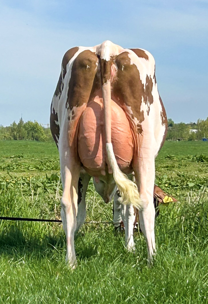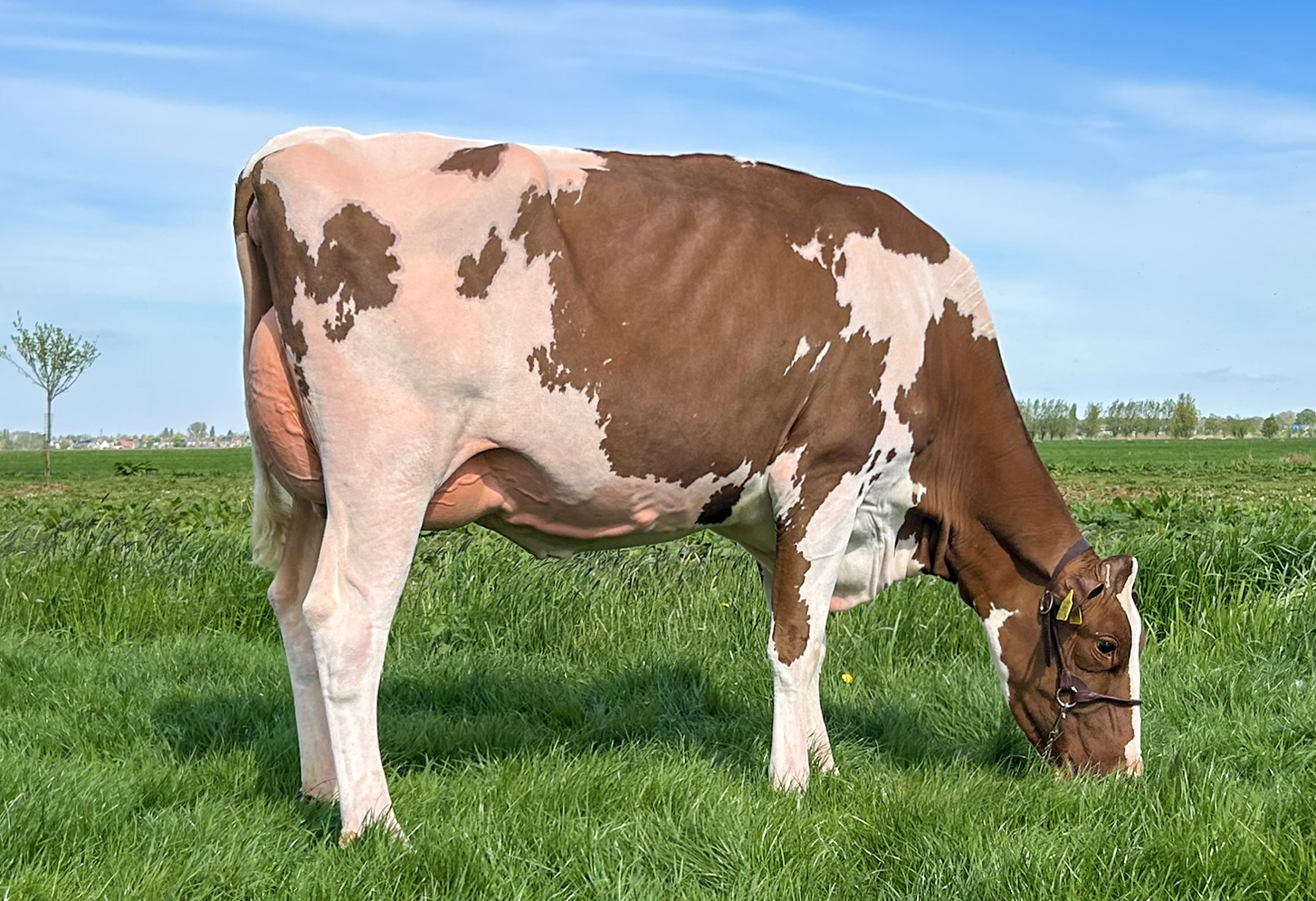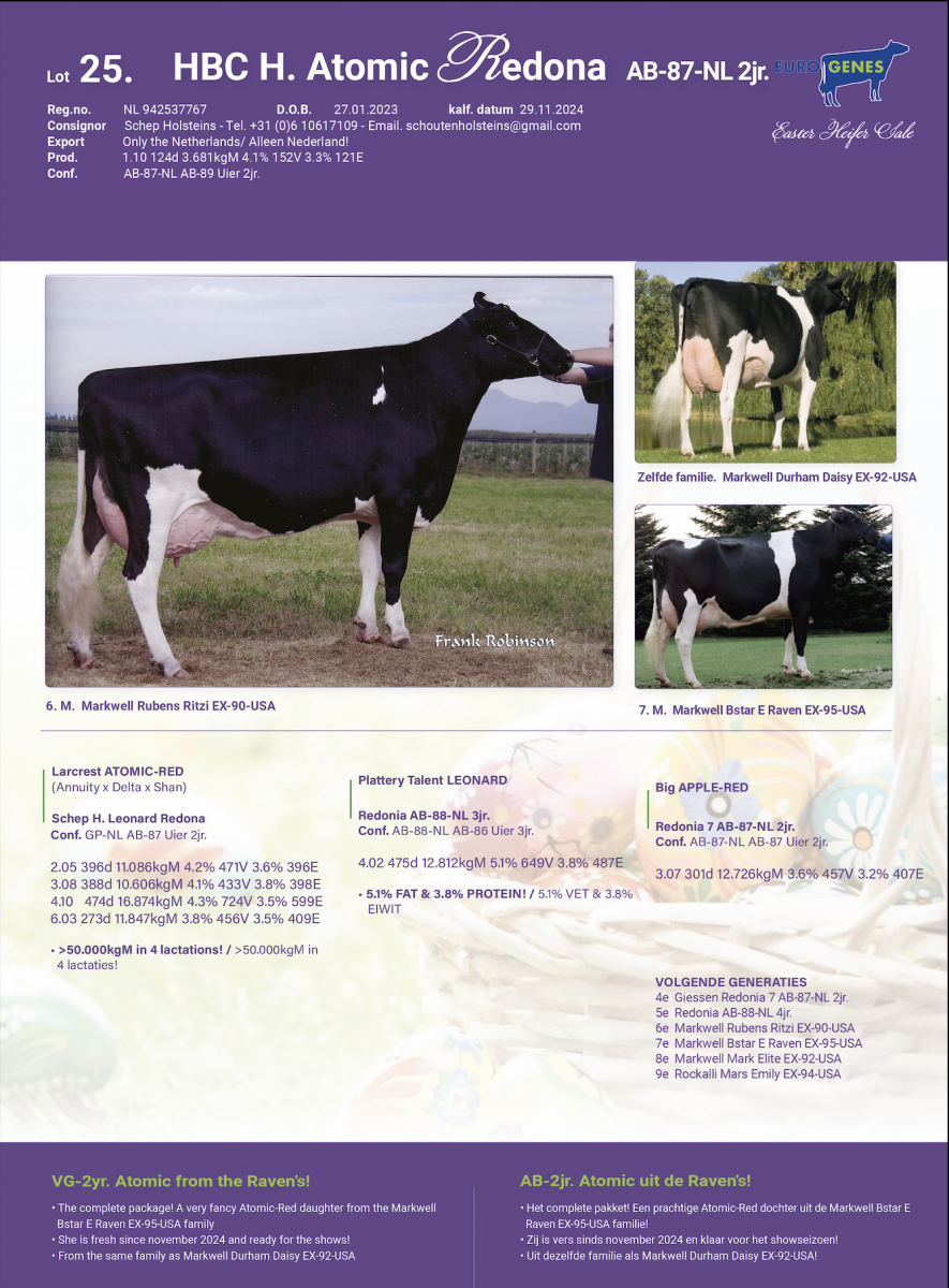 It's SHOW TIME! A lovely Larcrest Atomic-Red 2yr. old sells this week in the Easter Heifer Sale! She is classified with VG-87-NL 2yr. with the maximum score for her Mammary System: VG-89! She is fresh since november 2024 and ready for this showseason! Her dam is a GP-NL 2yr. old Leonard daughter followed by a VG-88-NL 2yr. Big Apple-Red daughter and goes back on Markwell Blackstar Raven EX-95-USA!