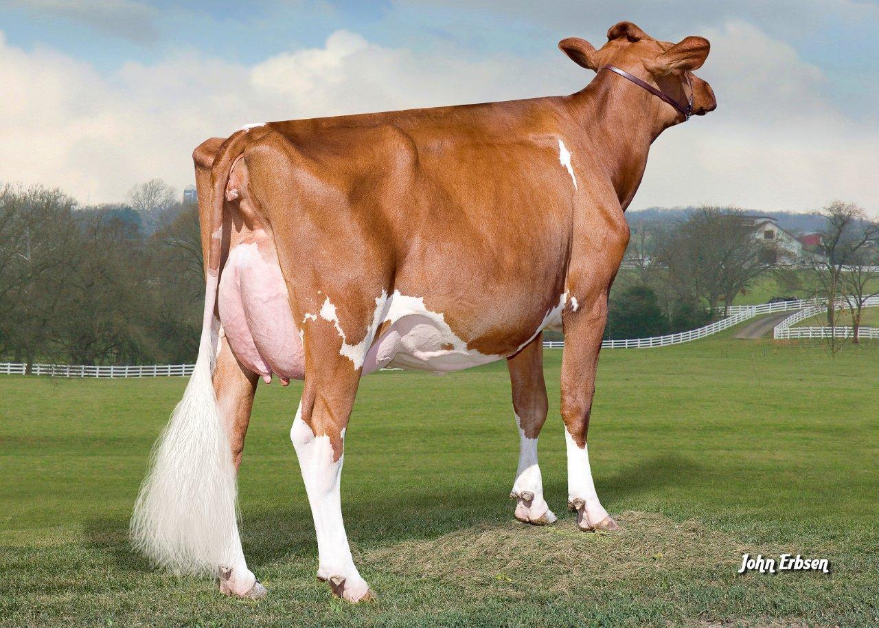 BTS Apple-Red, owned by GAEC Du Bontemps, is a fancy Durham Red grand daughter of THE RED cow of this moment, KHW Regiment Apple Red EX-95-USA. Apple was Res. Grand Champion R&W at the World Dairy Expo 2013 while her clone was Grand Champion R&W and her Talent dtr was HM Grand, this Talent dtr won the Reserve Grand Championship last week at the Royal Winter Fair for R&W. A full sister to this Talent is the mother to BTS Apple-Red.