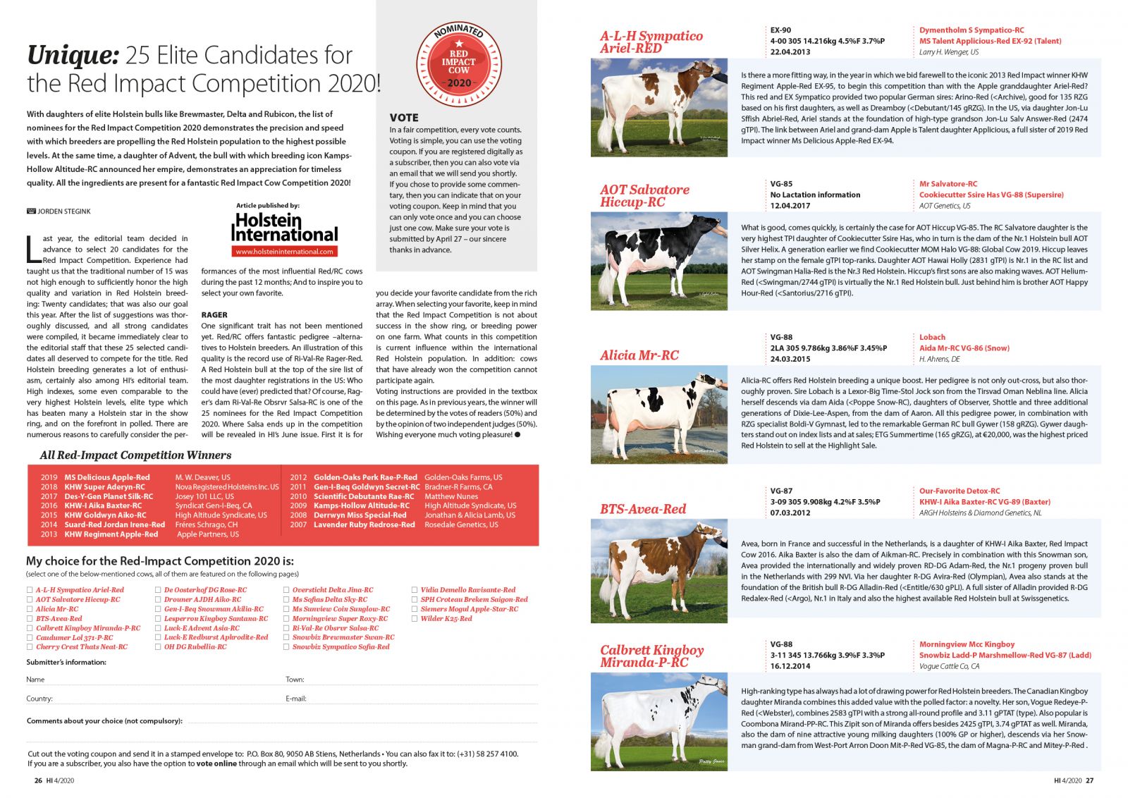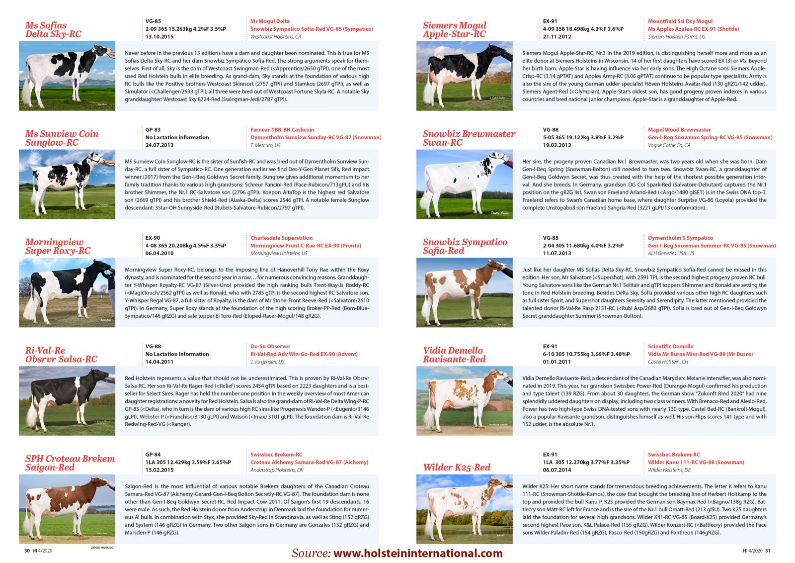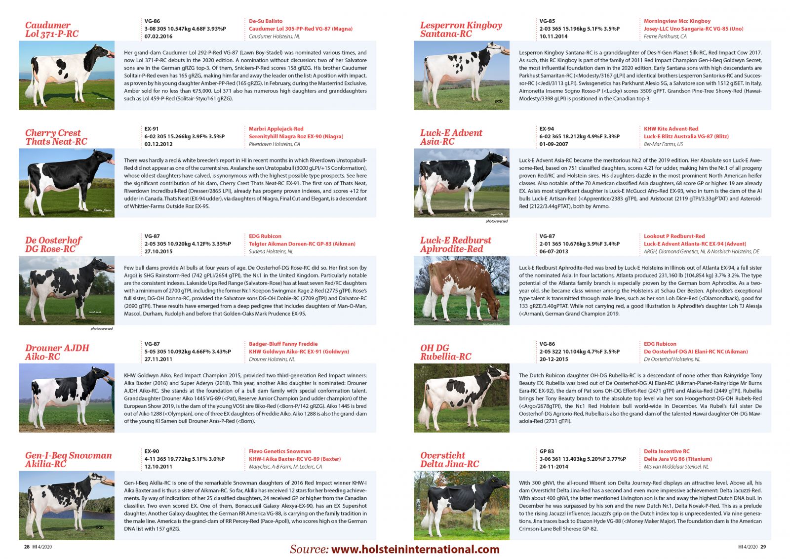 The April 2020 issue of the Holstein Internal brought us the 25 nominated cows for the Red Impact Competition 2020. In previous editions a selection of several cows who won the Red Impact title were: MS Delicious Apple-Red in 2019, KHW Super Aderyn *RC in 2018, Des-Y-Gen Planet Silk in 2017, KHW-I Baxter Aiko in 2016, KHW Goldwyn Aiko in 2015 and KHW Regiment Apple Red in 2013. No less than nine cows were bred, owned or delivered as an embryo bij Diamond Genetics & partners. Click further for the article and the nominated cows for this Global competition.