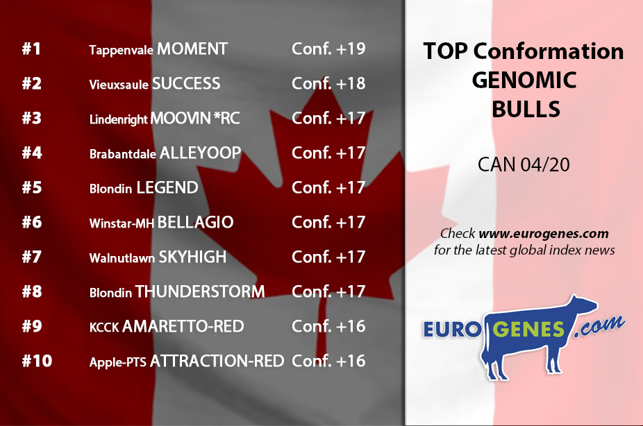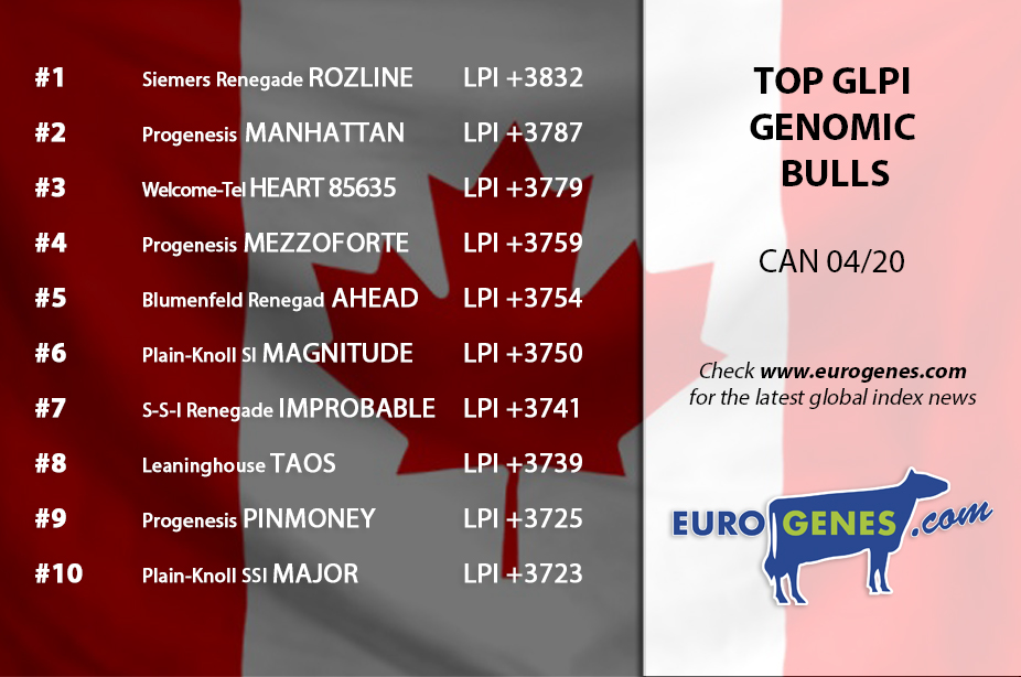 Renegade son Siemers Renegade ROZELINE takes charge in Canada at +3832 LPI. In second follows Progenesis Manhattan at +3787 LPI. At the third spot we find Welcome-Tel Heart at +3779 LPI. Topping the daughter proven LPI list is the Dutch Peak AltaMarlon at +3547 LPI. BOVA BOMBA is again the #1 Conformation bull in Canada and also the #1 daughter proven Conf. sire at +19 Conf. Closely followed by the genomic bull Tappenvale Moment at +19 Conf. as well.