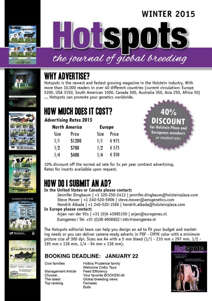 Reserve your advertising space now for the Hotspots Winter '15 edition! One of the greatest ways to advertise your genetics to a huge number of readers from all over the World, with >10.000 subscribers, the Hotspots is one of the most popular magazines in the Holstein industry. This issue with articles about the Holbra Prudence and Welcome Taya cow families, the latest Global breeding news, top rankings, show results and more! Reserve your advertising space this week!