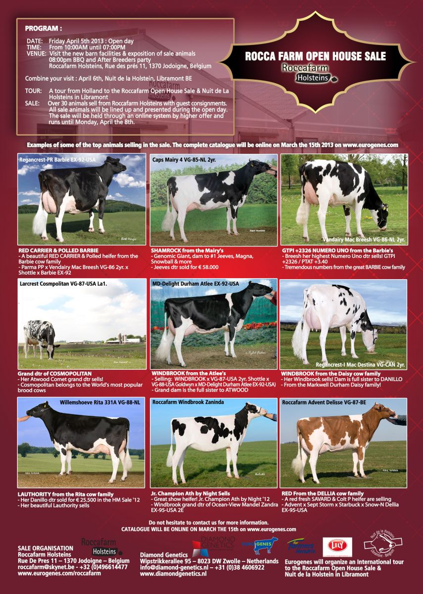 Roccafarm Holsteins from Belgium will open their doors on Friday the 5th of April. Come and watch the complete new barn in Jodoigne in Belgium. Eurogenes will organize a tour to the Sale and the International Show in Libramont which will held the next day, on Saturday April the 6th. Click further for the flyer of the ROCCAFARM SALE, all sale animals will be lined-up at the Open House. Bidding can be done online until Monday, April the 8th 2013. Interesting animals are selling like a RC and POLLED member of the Barbie's, a GTPI +2326 Numero Uno, a grand dtr of Larcrest Cosmopolitan and more!