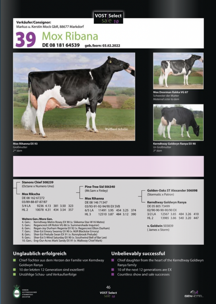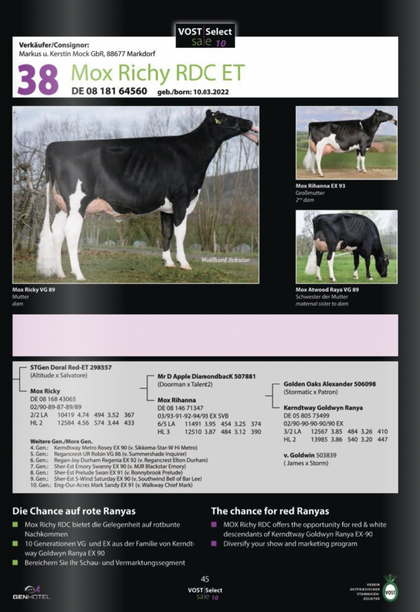 This friday sells Roubos Holsteins and Batouwe (Jr.) Holsteins the #1 RZG red and PP heifer in the breed at the Vost Select Sale. She sells as Lot 51: R&B Ailani PP Red. She is a Hugo PP *RC daughter out of R&B Solitair Aisha P Red. This Solitair P Red daughter is from Rhala Re Quickstep Red. She is a De Oosterhof DG Alaska-Red daughter and the maternal sister to the daughter proven sire: Blues-Red @ Ai-Total (+2621 GTPI / +645 NM$) and Batouwe RE Savio *RC @Semex. R&B Ailani PP Red is tracing back to the famous KHW Goldwyn Aiko *RC EX-91-USA DOM cowfamily. Mox Holsteins sells as Lot 38., Doral-Red daughter Mox Richy *RC. She is from Mox Ricky VG-89-DE La2. (s. Diamondback) out of Mox Rihanna EX-93-DE and tracing back to Kerndtway Goldwyn Ranya EX-90. From the same family sells Mox Holsteins Lot 39. Mox Ribana. She is a Stantons Chief daughter out of Mox Rikscha VG-87-DE La3. (s. Sid) out of Mox Rihanna.
