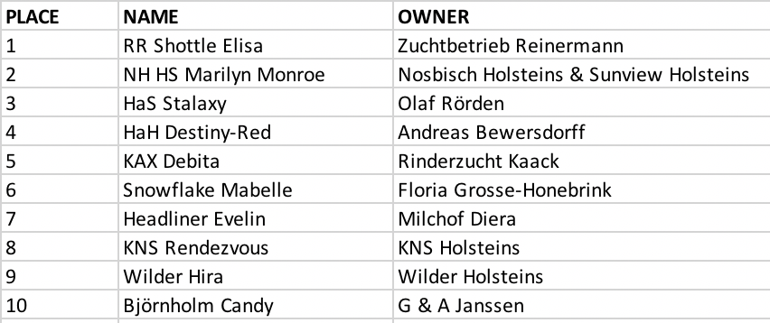 In the election of the German Cow of the Year 2018 there were many nominees for Eurogenes-members! 4 of the nominees made it into the top 10!! But the most exciting thing was that RR Shottle Elisa was chosen as cow of the year 2018! Congratulations to the family Reinermann! Second in the competion was NH HS Marilyn Monroe, the #1 producing cow in Germany and owned by Nosbisch Holsteins and Sunview Holstiens. KNS Rendezvous (the dam to BOSS) made it into the 8th place and Wilder Hira (grand dam to Hotspot P) to place 9.