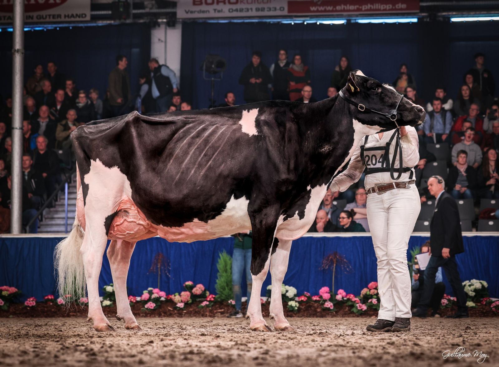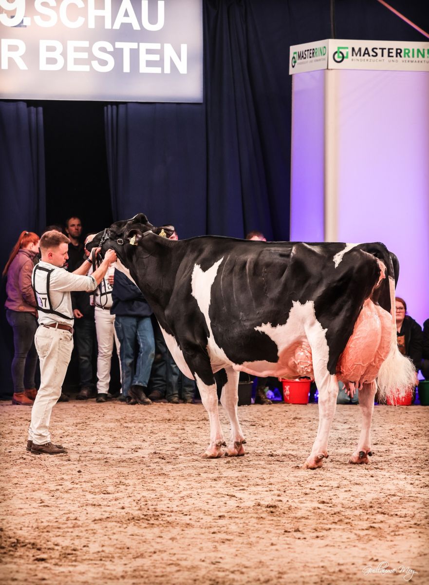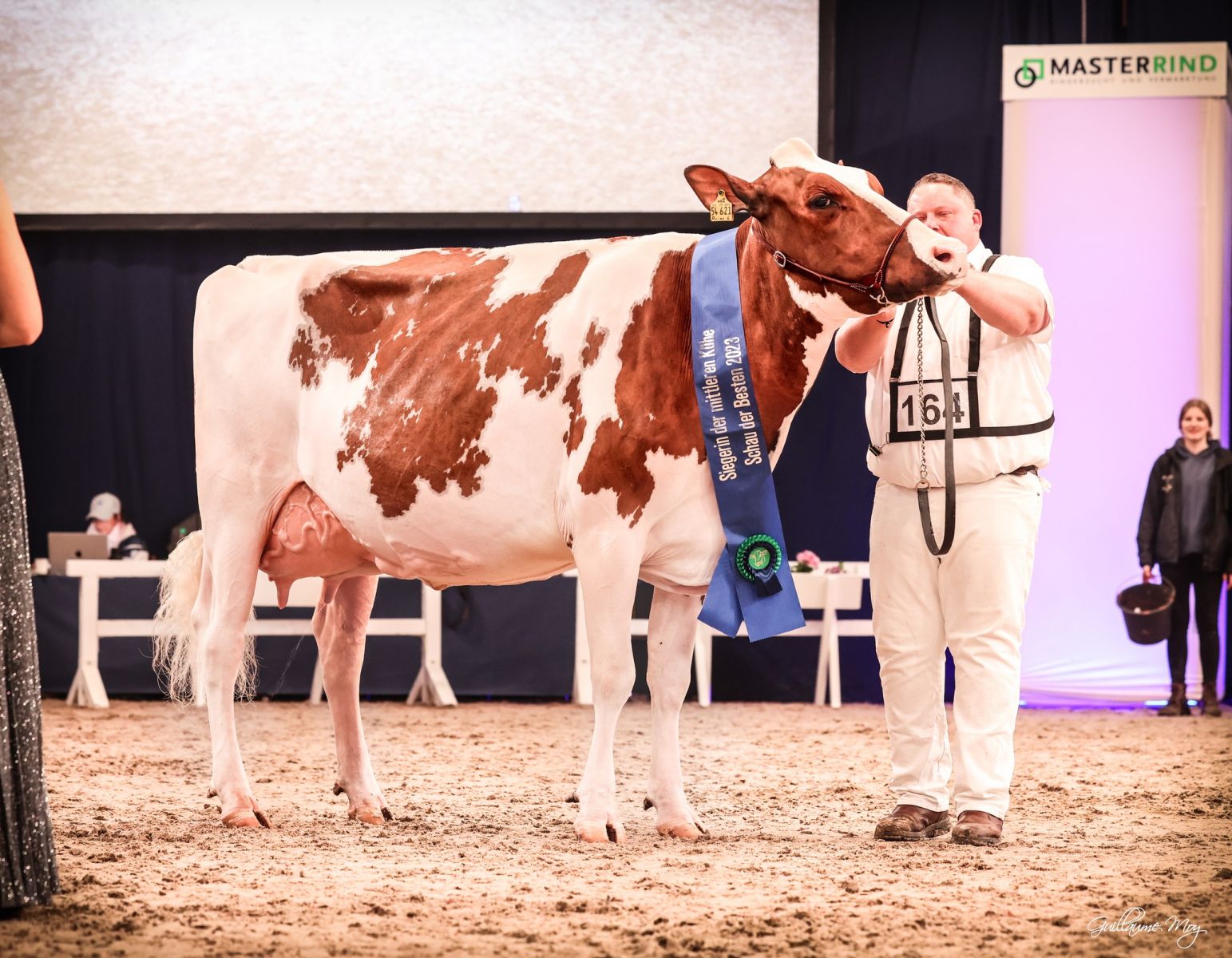 RS Maryrose (s. Arino-Red), is the new Grand Champion & Intermediate Champion of the 49. Schau der Besten, held in Verden, Germany. The classwinner and Senior Champion title was for Fux Tohuwabohu (s. Godewind), she is followed by the 11 years old Reserve Champion Senior cows: BWH Annika (s. Atwood). LOH TJ Alessja EX-95-DE was named as Honorable Mention Senior Champion. This extraordinary cow is owned by Nosbisch Holsteins, J. Lohmöller, T. Melbaum and M. Blaise. She is an Armani daughter out of Luck-E Redburst Aphrodite-Red VG-87-NL 3yr. Classwinner of the class with 2nd calvers was SH Ariel. She is a pretty Crushabull daughter straight out of HC Archrival Arianne VG-89-NL EX-MS 4yr. (MAX). She is sold as embryo from Schouten Holsteins to Franz-Bernd Meyer. The 2yr. old Champion of the show was Rosalie. She is a very stunning Mirand PP *RC daughter owned by Henrik Wille, Germany.