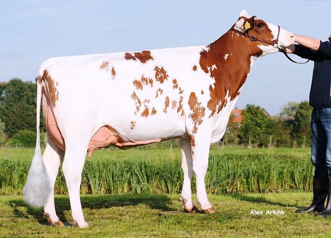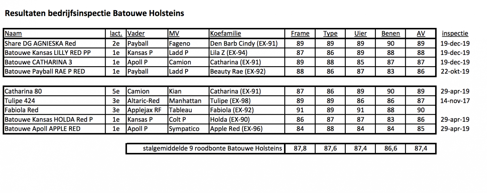 The incredible R&W show toppers at Batouwe Holsteins have increased their scores to phenomal good scores. The 2-Yr Old Champion R&W Hoornaar Show 2019: Batouwe Ks Lilly-PP-Red now scores VG-88-NL with VG-89-MS in her 1st lactation. Her herdmate Share DG Agnieska-Red increases her score fresh with her 2nd calf to VG-89-NL with EX-90 for her feed and legs. The other great R&W cow Batouwe Catharina 3 (s. Apoll-P x Catharina 80-Red s. Camion) now notes VG-87-NL VG-MS in her 1st lactation. With these 3 new scored cows the herd average at Batouwe Holsteins of their R&W cows maintains VG-87,4 with VG-87,4-MS.
