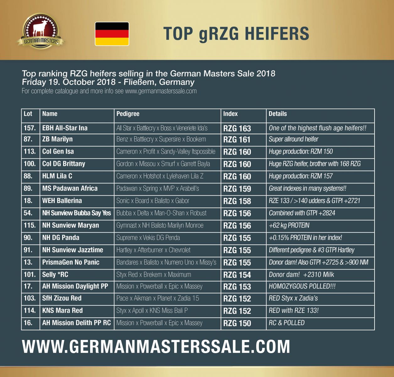 No less than 5 heifers of 160 RZG & higher are selling in the GERMAN MASTERS SALE 2018 as well some of the highest RC / R&W and POLLED heifers! Watch for a complete overview of the highest RZG heifers here!