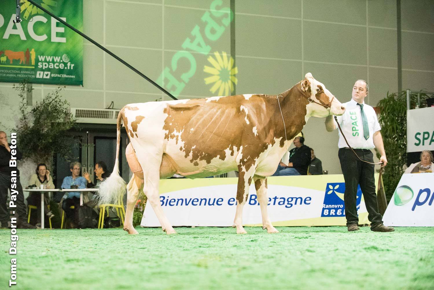 RZH Enya-Red of Diamond Genetics & Rijnhof Holsteins (bred by RZH Holsteins, Germany) has achieved a unique performance yesterday at the French National Show, the SPACE 2017! She won the Res. Intermediate Championship between in the very strong B&W competition! A performance which has never often seen before in a National Show!! Enya has the complete package as a R&W Ladd P from Rainyridge Mr Burns Eara EX-92 - going back on the oldest World Dairy Expo Grand Champion in the history: Rainyrige Tony Beauty EX-CAN! Click futher for her pictures and more info.