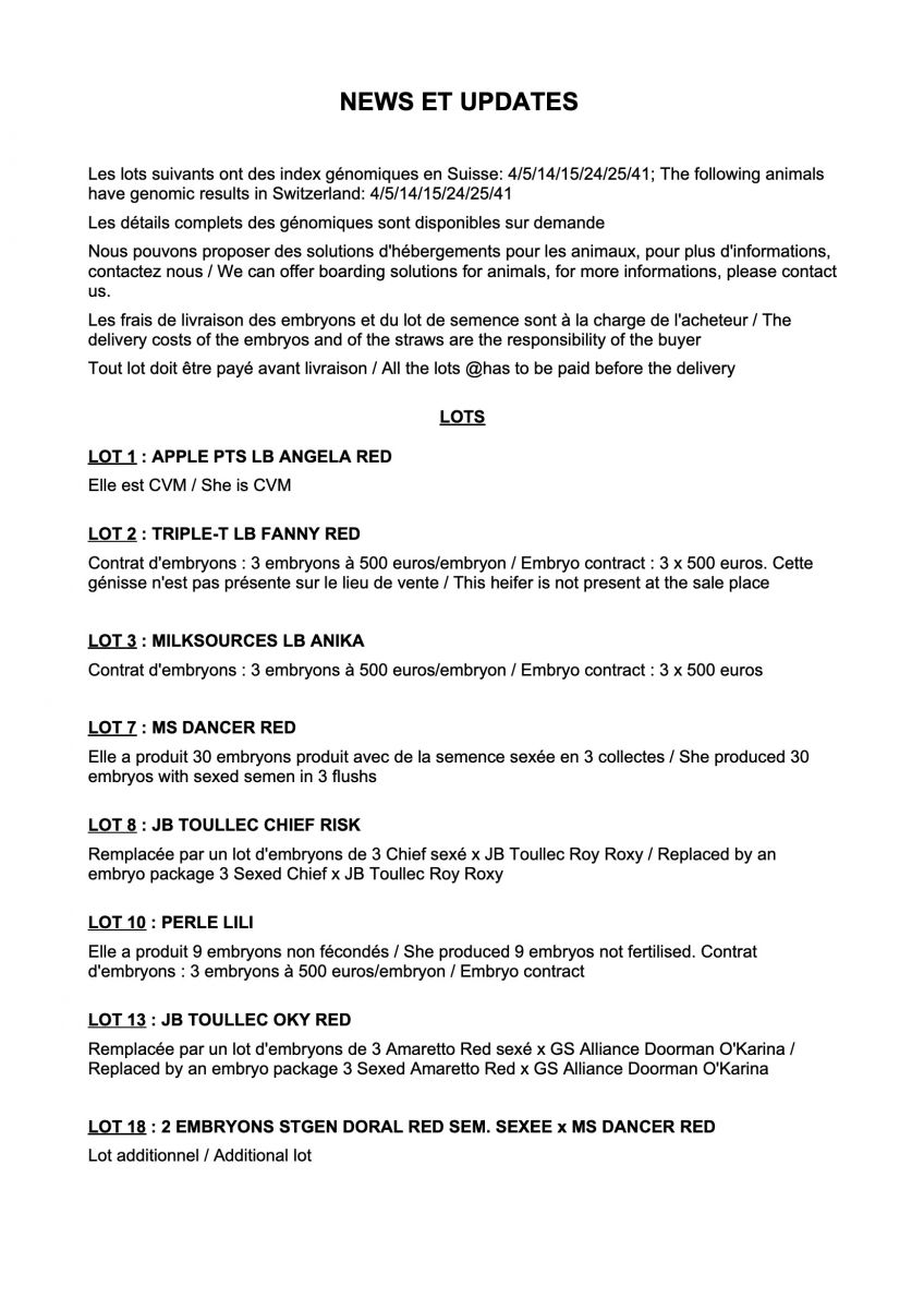 The SALE UPDATE of the Online VENTE La Brasserie Holstein is available!! This SALE UPDATE also includes the embryo and bull contracts on the great lots selling in this ONLINE SALE. The auction started last Thursday evening at 6:00 P.M. (French-time) and can be attended through the SALE SITE. More info can be requested through the sale organisation.