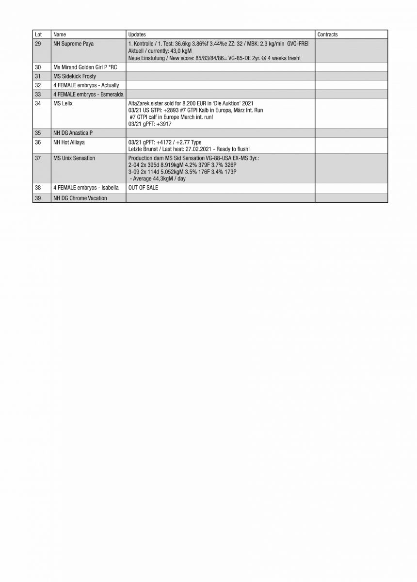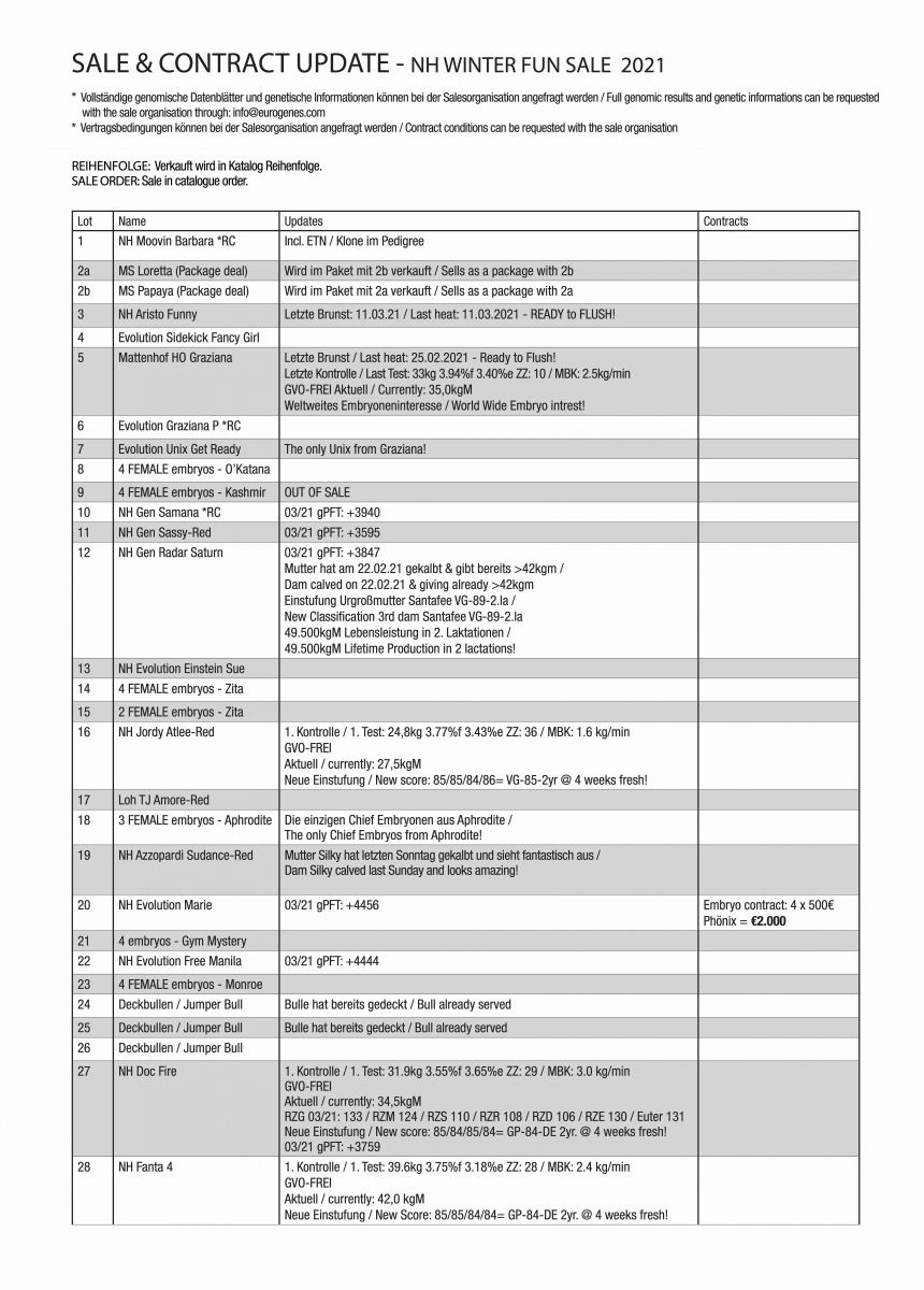 The SALE UPDATE of the Nosbisch Holsteins Winter Fun Sale is now ONLINE available for you. This SALE UPDATE includes also contracts on the lots selling in the NH Winter Fun Sale. The auction will start TONIGHT at 7:30 P.M. (German-time) and can be attended through the SALE SITE. More info can be requested through the sale organisation.