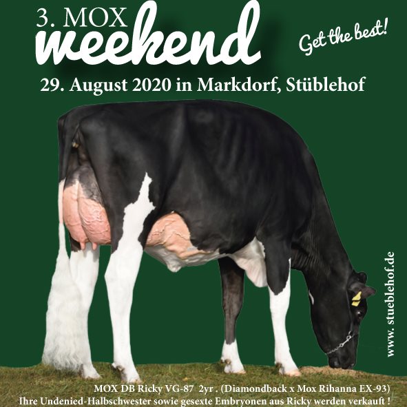 Get the best! That's the slogan of the 3. MOX WEEKEND which will be held 29 August in Markdorf, Germany. Selling are >60 heifers or cows and interesting embryo packages. With for example Mox Diamondback Ricky VG-87-DE 2yr. (in the picture of the flyer) her Undenied maternal sister and embryos from Ricky herself!! New this year is the possibility to bid on a lot before five o'clock in the afternoon (still auction), afterwards the lot will sell. Click further for more info.