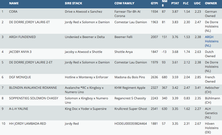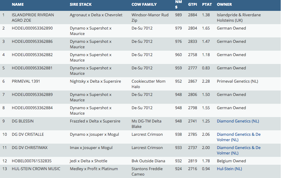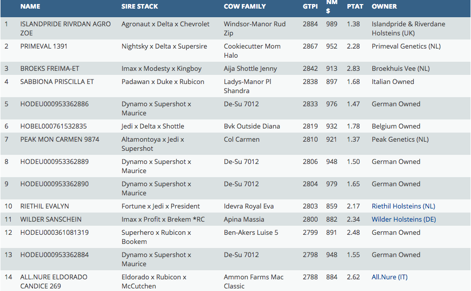 The monthly intermediate rankings are online of the European tested females on American base with Islandpride Riverdane Agronau Zoe on the 1st place this month with GTPI +2884 - she is an Agronaut x Delta x Vekis Chevrolet from the Windsor-Manor Rud Zip cow family. Multiple Eurogenes members were very successful for example: Riethil Holsteins which added 2 new GTPI toppers with +2803 & +2764 GTPI and Wilder with 4 heifers in the list >2700 GTPI!