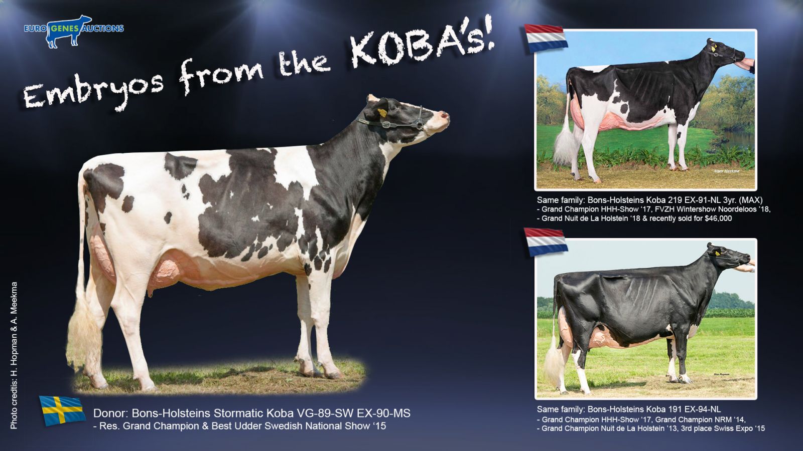 It's time to set on your sights: embryos by FEM. Solomon / Conv. Lavanguard are selling from the huge transmitting showcow Bons-Holsteins Stormatic Koba VG-89-SW EX-90-MS. Koba was Reserve Grand Champion, Intermediate Champion & Best Udder at the Swedish National Show in 2015!! She is close family to the Grand Champion Nuit de La Holsteins 2018 & Grand Champion HHH-Show '17: Bons-Holsteins Koba 219 EX-91-NL 3yr. (MAX). This extraordinary cow is recently sold for 50% to Westcoast Holsteins in the Sale of Stars and is ready for the big shows coming up!