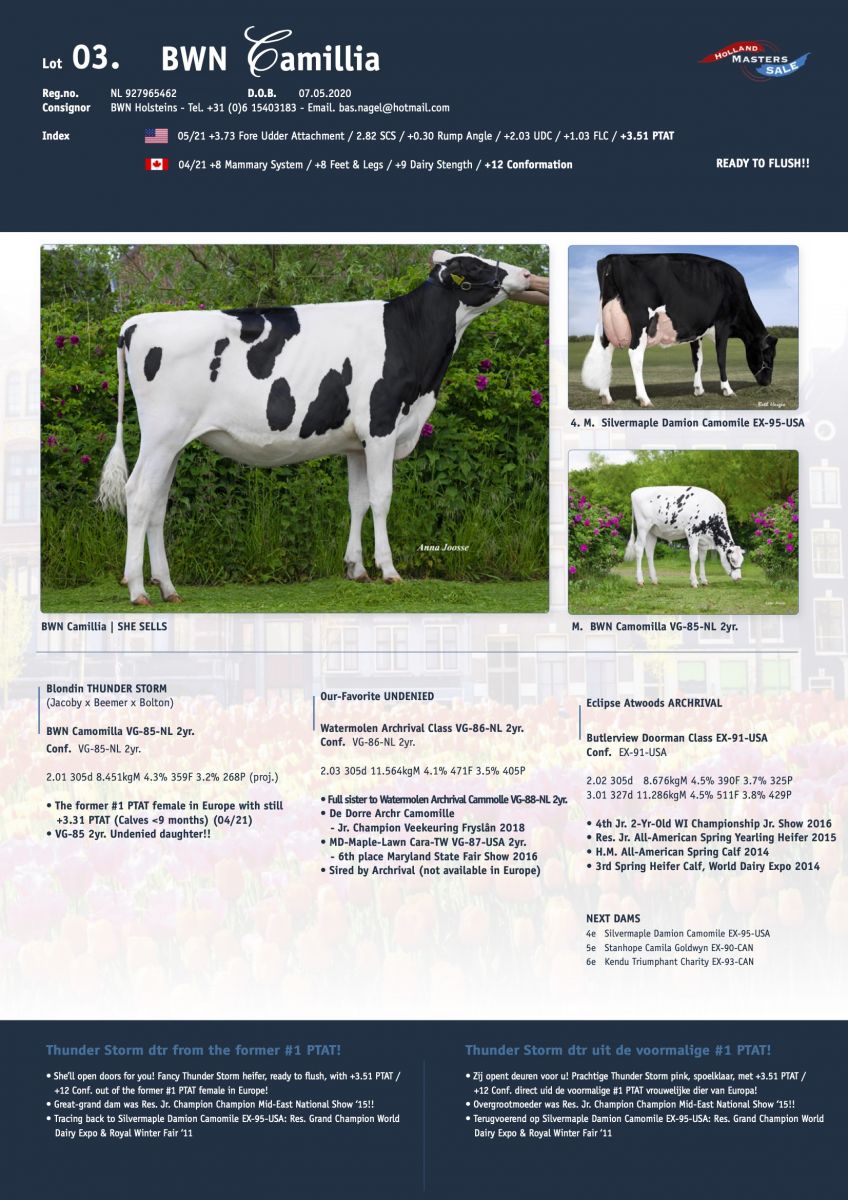 It's SHOW TIME! A lovely Blondin THUNDER STORM (one of the first dtrs scored VG-88-USA 2yr.) heifer sells from the former #1 PTAT female in Europe: BWN Camomilla VG-85-NL 2yr. BWN Camillia tests +3.51 PTAT / +12 Conformation and will open door for you! She is backed by the Reserve Grand Champion World Dairy Expo & Royal Winter Fair 2011: Silvermaple Damion Camomile EX-95-USA. A full article about Camomile and her influence can be found in the newest Holstein International issue.