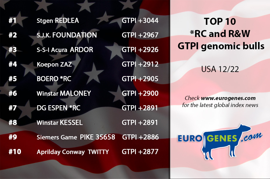 The chart topper in the Genomic *RC and Red&White index with all bulls >12 months with NAAB-Code is again Stgen RC Redlea at +3044 GTPI. He is followed by Captain son S.J.K. Foundation *RC @Ai-Total at +2967 GTPI. This Captain son out of Avance-Red daughter Primeval 5121 is tracing back to the well-known Kamps-Hollow Altitude *RC EX-95-USA cow family. He has amazing milkproduction traits with >1500kgM with +0.12% Fat and +0.05% Protein and +157 Combined F+P. He scores 1.7% for Sire Calving Ease, what is suitable to use on heifers and has +0.7 DPR. Making this *RC and R&W GTPI ranking complete with S-S-I Acura Ardor at +2926 GTPI. Furhtermore at the 7th spot we find newcomer DG Espen *RC at +2891 GTPI. This Crisalis *RC son has as 4th dam All.Nure Supersire Eleonor VG-88-NL, she is dam to the sire DG Eldorado. Espen *RC shows amazing production, health and type traits with >1500kgM and positive components, +2.58 SCS, +1.2 DPR, 1.9% SCE, +1.46 PTAT, sloped and wide rumps and ROBOT Udders! At spot 15 we find Aurora Mitchell son DG DGF Boraz *RC at +2858 GTPI!
