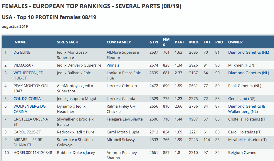 It's time for an interesting ranking on the trait PROTEIN!! Today the top 10 PROTEIN females based on GTPI in Europe!! There are some tittle changes comparing this list to the foreign April 2019 proof. Jedi has again a lot of influence in the list with delivering 7 daughters and grand daughters in the top 10!! The #1 protein female is this run DG Eline with +91 lbs protein. For sure she is an Jedi daughter and she traces back to the great transmitting family of of All.Nure Supersire Eleonor VG-88-IT. At place #2 we find Vilma 6507 again an Jedi daughter with +90 lbs protein. Her maternal sister sold in the European Masters Sale '19 to Roccafarm Holsteins & T. Adams. Wetherton Jedi Hue makes the top 3 complete with +90 lbs protein at a shared 2nd place. This heifer is a grand daughter of Lookout Pesce Epic Hue VG-86-USA 2yr. - the grand dam to Progenesis FORTUNE @ Semex.