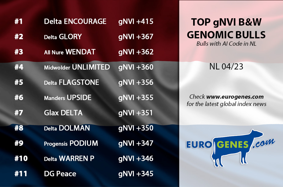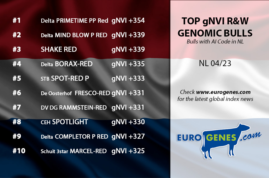 The Dutch gNVI indexes are now ONLINE available. There are some changes, normally there is a basic adjustment every five years, from now it's once a year. All the bulls decrease this turn in their Dutch index 69 NVI points and the red-and-white bulls -331kgM and the black-and-white bulls -289kgM. Caudumer Solitair P Red is the nr. 1 NVI Red&White Daughter Proven Sire in the Netherlands this run at +249 gNVI! He is followed by COL DG Spark-Red at +243 gNVI. The Mr. Salvatore *RC son has a huge production index with +2362kgM! At the third place we find Hoogerhorst DG OH Rubels-Red at +240 gNVI! He shows a balanced profile with 376 daughter in his index and +1545kgM with +0.17% Fat and +0.01% Protein and +114 Udders!!! The Nr. 1 R&W gNVI sire in the Daughter Proven Interbull list is Zoom-Red at +259 NVI. He is followed by Rhala Re Blues-Red @Ai-Total at +245 NVI and making the Top 3 complete with Barendonk Ronaldo at +210 gNVI. In the R&W gNVI Genomic sire list we find DV DG Rammstein-Red @Ai-Total at the 7th spot at +331 gNVI. The Nr. 1 in this ranking is Delta Primetime PP Red at +354 gNVI.