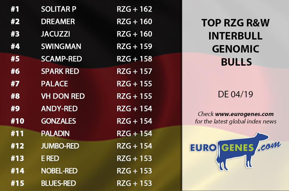 In the R&W RZG rankings in Germany is Caudummer Solitar P still leading the list with +162 RZG!! He is topping the R&W interbull genomic list followed by Dreamer who notes +160 RZG. Spark-Red holds his level and notes +157 which is good enough for the #6 place!! Spark Red is bred through the Genesland program and is a Salvatore x Debutant out of the Splendor Family. Other highlights in the Interbull list are Andy-Red (+154 RZG) and Blues-Red (+153 RZG). Andy-Red is an Anreli son from the Leanne family and Blues-Red comes straight out the KHW Goldwyn Aiko family which makes him one of the highest R&W RZG Apple descendant's!! The list with at least 500 milking daughters in Germany is also still leading by Apoll P (+144 RZG) with 1482 daughters. Followed by Sunny-Red with +142 RZG and 623 daughters in production.