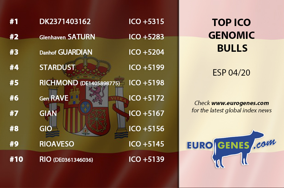 The Danish bull Tirsvad Hotspot GEYSER *PC came out as the new chart topper in Spain today! He notes +5315 ICO and is a Hotspot P son from Tirsvad Sniper Gambia-ET. In second follows Glenhaven SATURN at +5283 ICO. The third spot is for Danhof GUARIDIAN at +5204 ICO. The #1 daughter proven Spanish bull is this run the domestic bull JULIUS ET at +4176 ICO. In second follows S-S-I Snowman Mayflower with +4105 ICO.