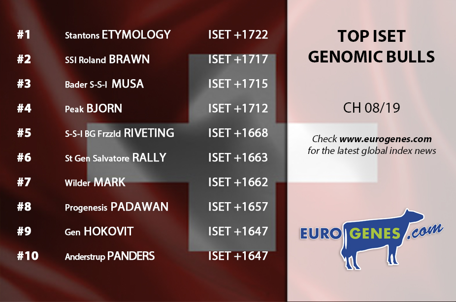 The chart topper in the SWISS ISET system is Stantons Etymology is +1722 ISET. This Guarantee son provides >2000 Milk in combination with +143 IPL and +140 ITP!! He is closely followed by SSI Rolan BRAWN who notes +1717 ISET. The former leader in the Swiss system Musa notes now +1715 ISET at place 3. The #1 daughter proven sire with Swiss milking daughters is Brekem *RC with +1458 ISET and 96 daughters. Followed by Enforcer with +1446 ISET and 192 daughters. The R&W Aikman *RC son ALPHAMAN claims the 11th position with 117 daughters and +1388 ISET.
