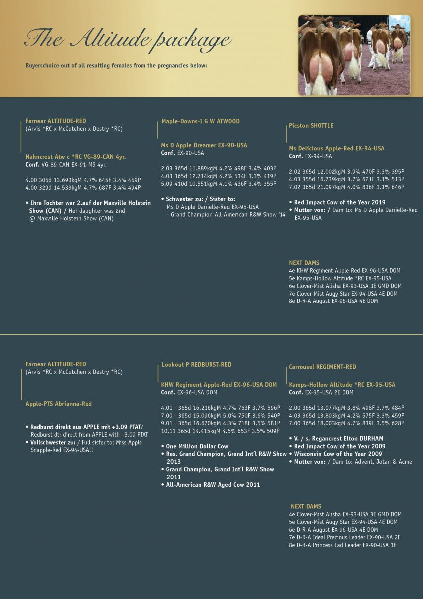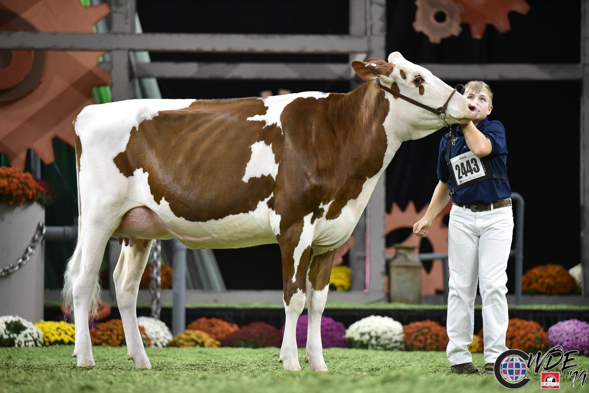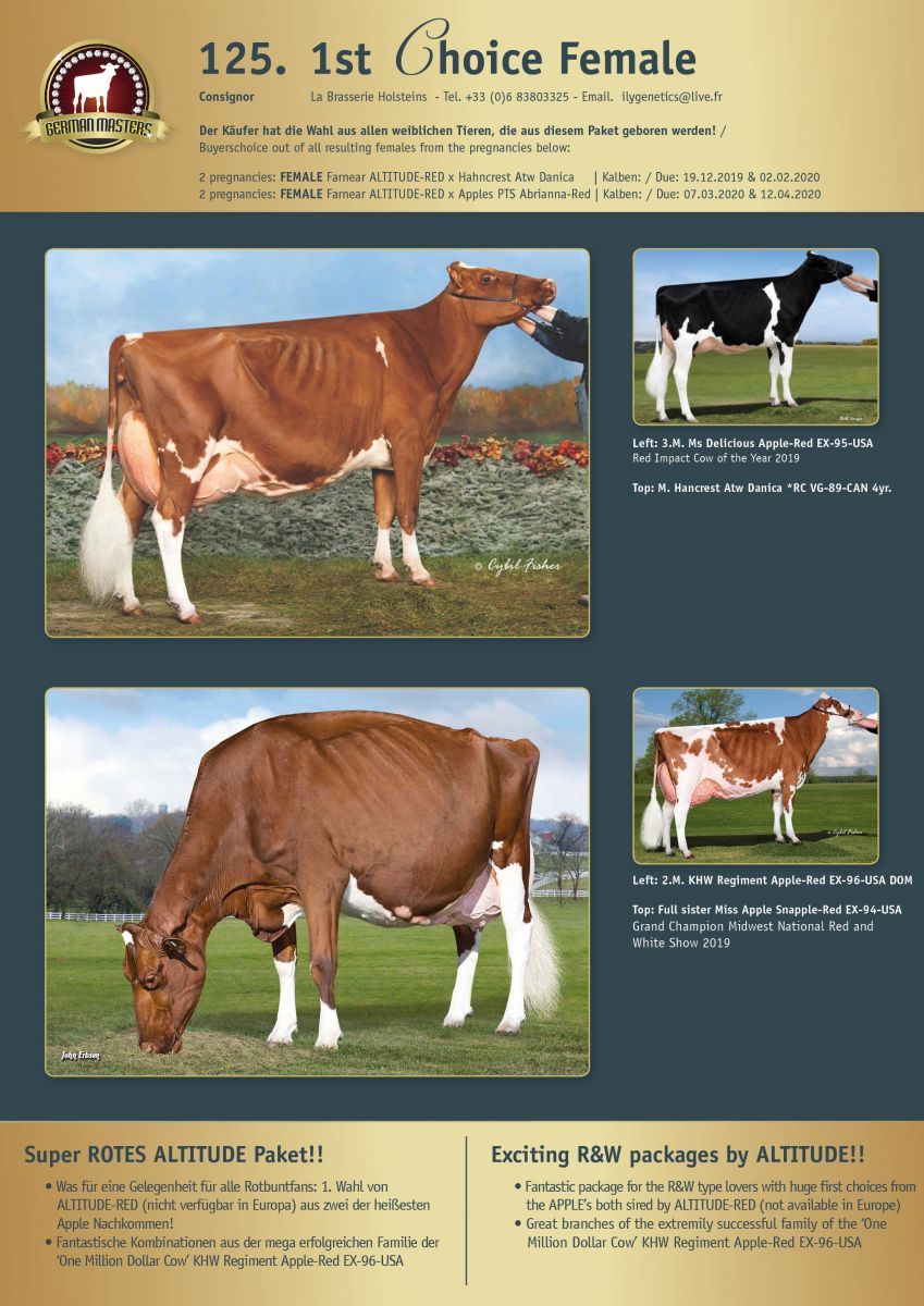 Blondin Avalanche Darleen, she is definitely one of the most spoken promising R&W young cows at World Dairy Expo. She was 2nd & 1st Bred & Owned in the Milking Yearling class at the World Dairy Expo last week in Madison, Wisconsin. Her ALTITUDE-RED sister sells as a first choice as lot 125 in the German Masters Sale 2019!! Her dam Hahncrest Atw Danica *RC VG-89-CAN 4yr. delivered also the classwinner at the Junior Show of the Royal Winter Fair 2018: Blondin Jordy Dakota (s. Jordy-Red). Another R&W full brother to Darleen notes +4.82 PTAT: Mr Blondin Avlnc Dom Red. The other option choice from the incredible first choice is a R&W ALTITUDE-RED daughter of Apple-PTS Abrianna-Red. This Redburst daughter directly from KHW Regiment Apple-Red EX-96-USA DOM 19* herself was 7th in the Milking Yearling class with just 2 weeks fresh!! Her full sister Miss Apple Snapple-Red EX-94-USA was 2nd in the 125,000 Lb. Production class. The chance to starting the year out right!!