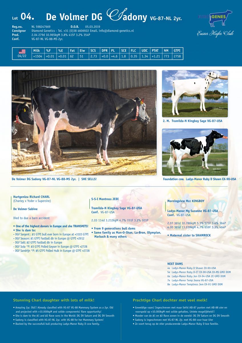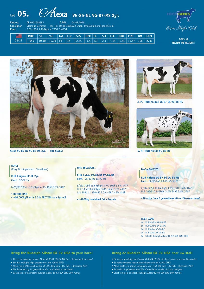 This week in the Easter Heifer Sale are two beautiful 2yr. olds selling with a bright future! Lot 4. is the gorgeous De Volmer DG Sadony. She is classified with VG-87-NL 2yr. with VG-88 for her fantastic Mammary System. She produced more than >11,000kgM in 280 days and her current day production is still >35kgM! Sadony is dam to the #1 and #2 Gen Rave sons in the world: DG DV Saturn & DG DV Smooth. Sadony is a stunning Charl daughter out of De Volmer Sabine. De Volmer Sabine is a Jedi daughter and she TRANSMITS! Sabine is dam to DGF Sargeant the #1 GTPI bull ever born in Europe at +3103 GTPI. Another 2yr. olds who sells is Lot 5. Alexa VG-85-NL VG-87-MS 2yr. She is a fresh Royce daughter backed by Sildahl Rudolph Allstar EX-92-USA and has amazing components up to 4.7% Fat and 3.6% Protein. Alexa has still +2731 GTPI and has multiple progeny testing over the >2900 GTPI!