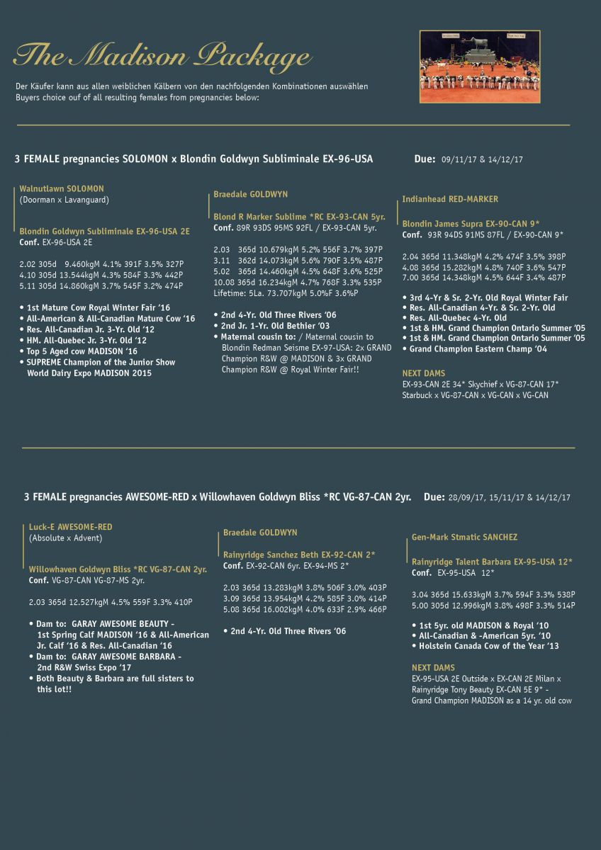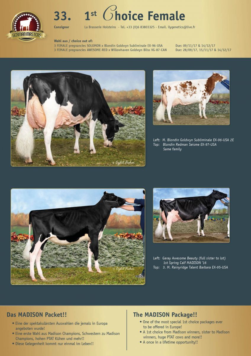 Blondin Goldwyn Subliminale really impressed during the World Dairy Expo last week winning the Production Class before the previous Supreme Champion Katrysha! Also her first offspring made a huge impression during the highest quality show on earth, her daughter Budjon-Vail Atwood Stylish was in the Top 5 of the Milking 1-Yr. Class and Best Udder!!! A SOLOMON daughter out of Subliminale SELLS as Lot 33 in the German Masters Sale in the Madison package! One of the greatest SHOW TYPE lots to be offered ever in Europe! Click further for pictures and more info!