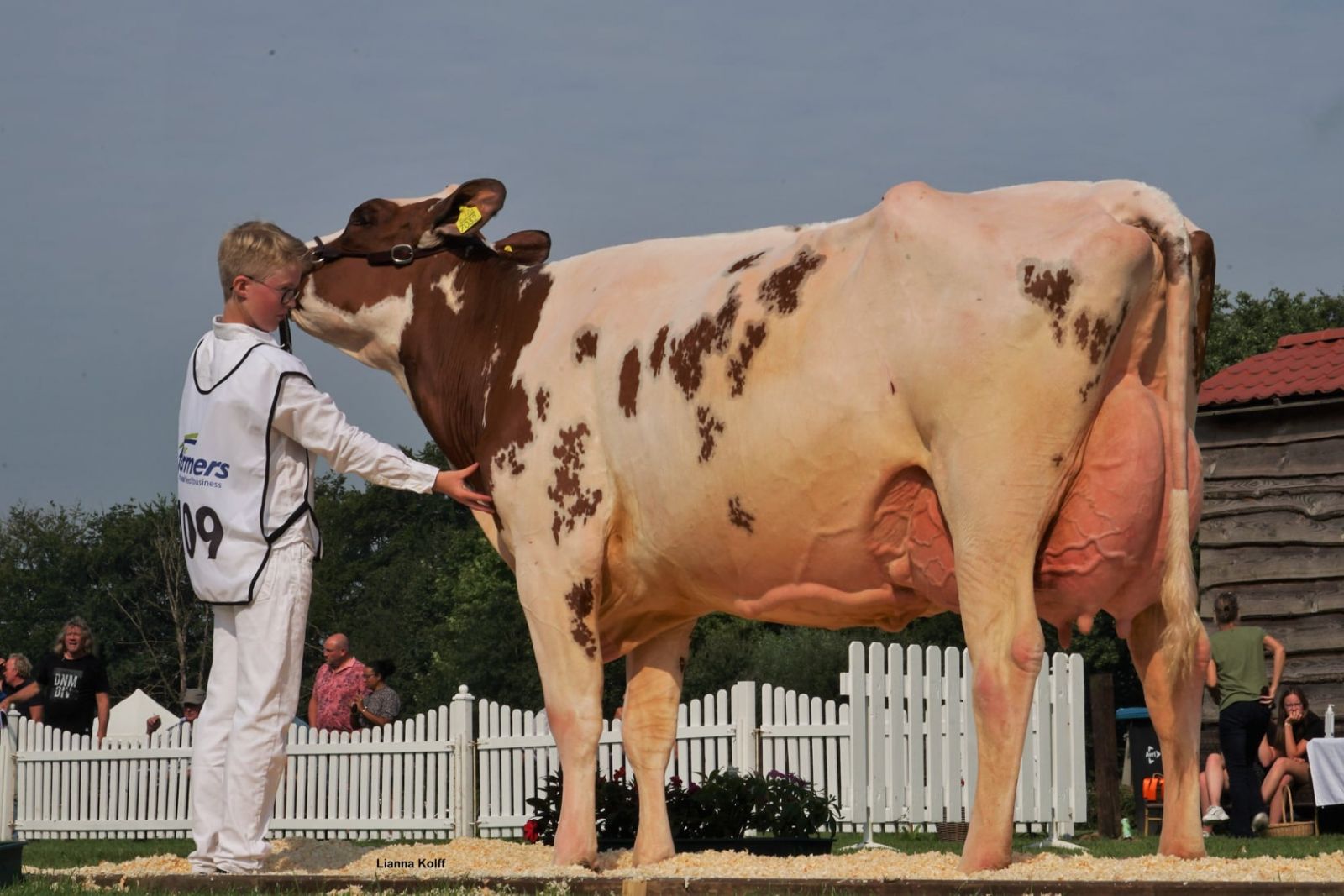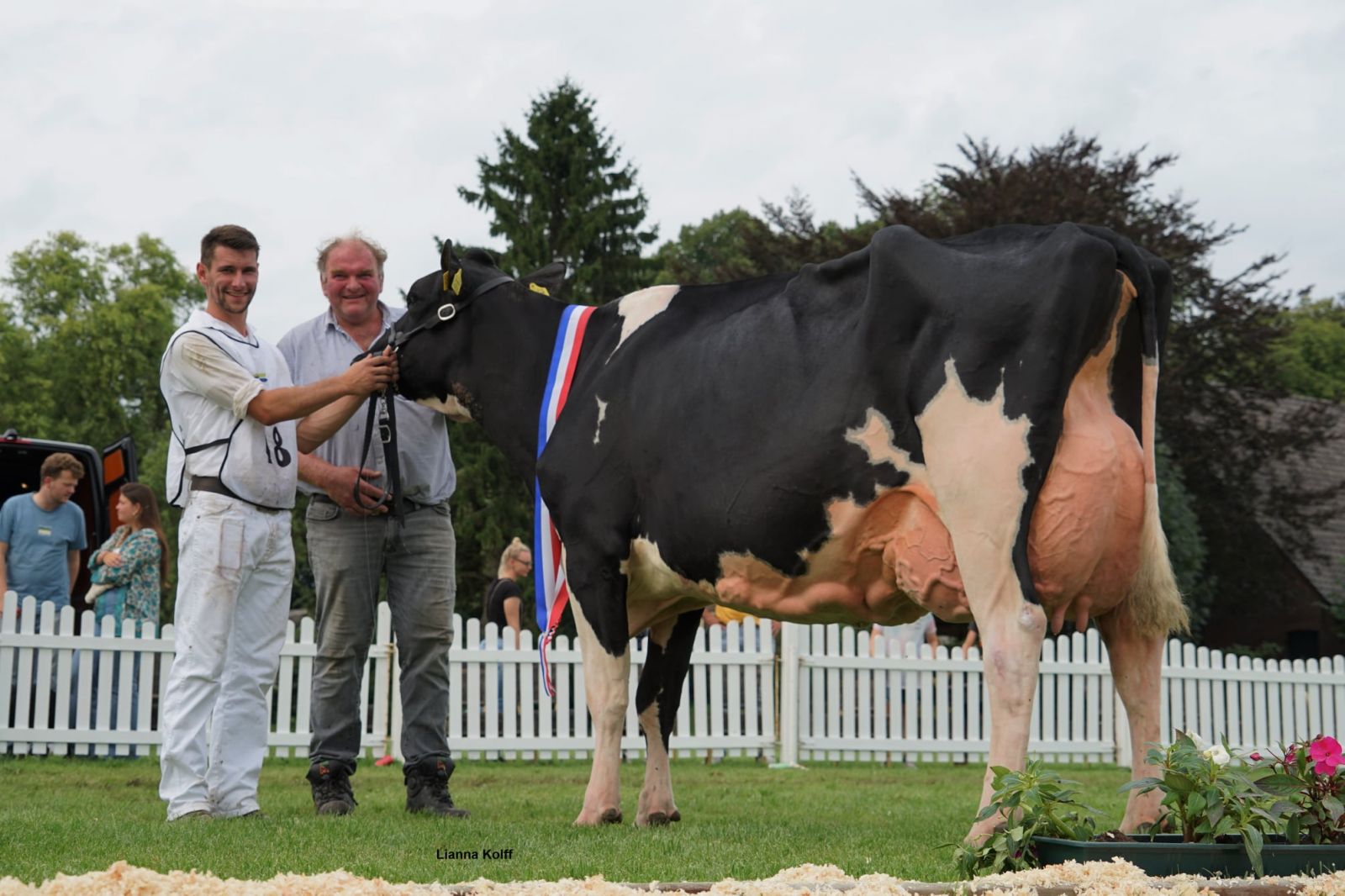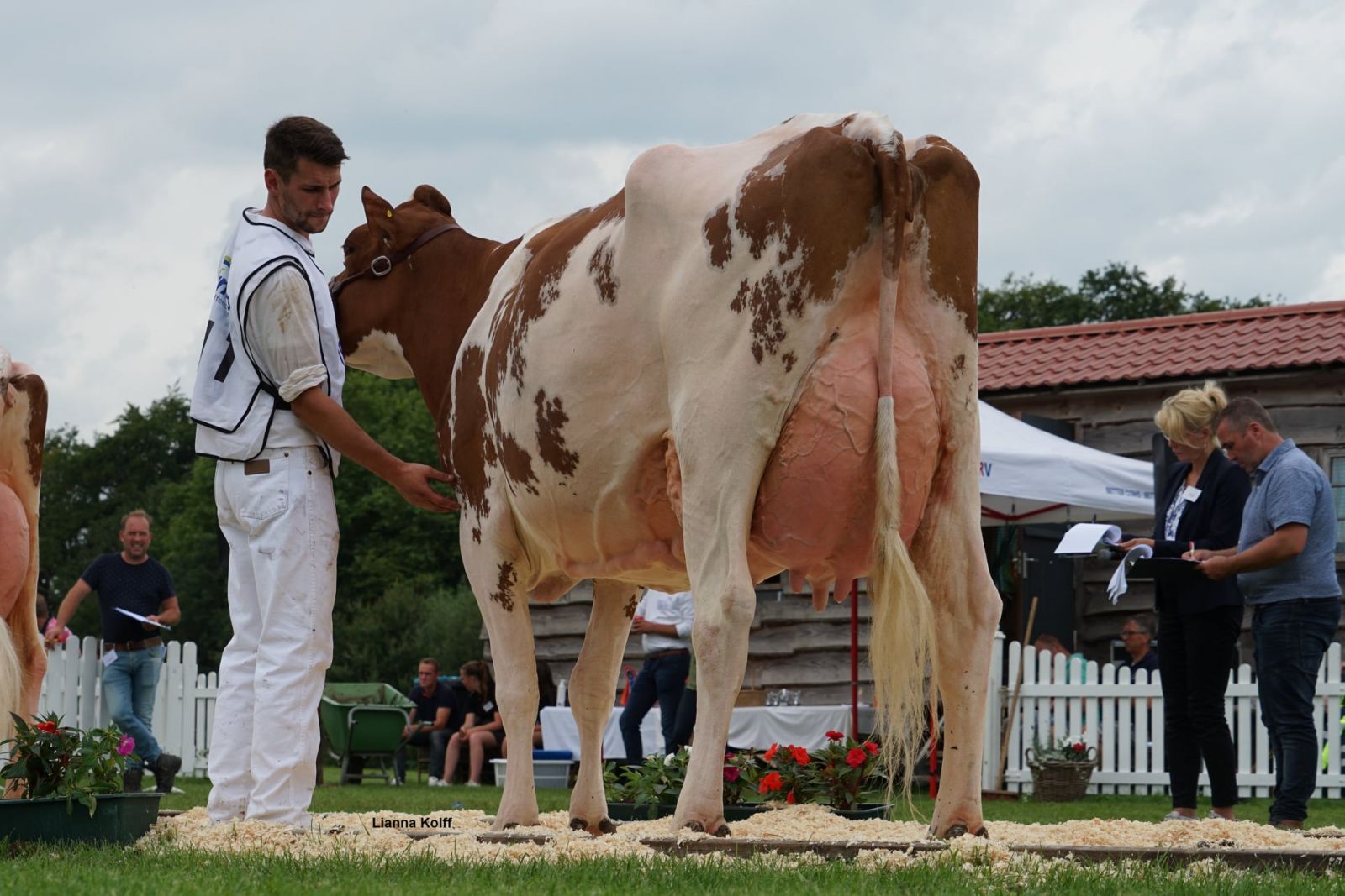 It was very sucessful day for Schouten Holsteins, Batouwe Holsteins and JK Eder Holsteins at the Dairy Fair Mariënwaerdt in Beesd. It was the very first show in the Netherlands since Covid in the Netherlands. For JK Eder Holsteins, JK Eder DG King Doc Elise (King Doc x Brady x Doorman x Numero Uno x Carf Emeraude EX-91-NL) won the Best Udder of her class & was H.M. 2-Yr Old Champion, JK Eder Jedi Evalyn (Jedi x President x Ricecrest Luke Lauren EX-91-USA family) won her class, Best Udder and was Reserve Intermediate Champion of the show. JK Eder Montana Hoine 4 (Montana from the Peckenstein Luke Kirsten EX-91-USA family) either won her class and was H.M. Intermediate Champion of the show. The only R&W JK Eder Holsteins brought to Beesd: JK Eder Apoll-P Roxinne (backed by the Roxy's) was 2nd and Reserve Intermediate Champion of the R&W show. Schouten Holsteins was sucessful with a fresh second calver by Darlingo of Seeger's Aftershock Indiana EX-92-NL. Batouwe Holsteins had a great R&W show. Batouwe Ks Lilly PP-Red (Kansas-P sister to Zeta-Red @ Aberkin) won her class and was H.M. Intermediate Champion. Her herdmate Batouwe Jordy Belladonna (s. Jordy-Red) was crowned as H.M. 2-Yr Old Champion of the Red & White show. This Jordy-Red is a grand daughter of the EX-92-DE EX-94-MS well-known Swiss Jotan daughter: All-Star Jotan Bella. The Grand Champion went to De Winkels Princess, a Bradnick daughter exhibited by Henk-Jan van Driel.