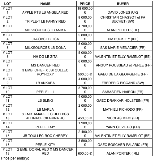 A great success of the first ONLINE edition of the Vente de La Brasserie Holstein. Many people from all around Europe attended this ONLINE TAG+ Sale and took adventage of the super heifers and embryo packages selling. The 18 lots selling averaged €5.500 with lots sold to 5 different countries and a clearance of 94%.