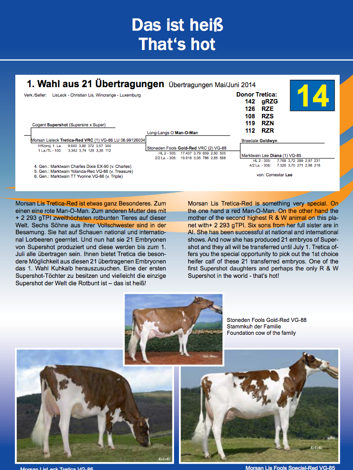 Lis Leck Holsteins from Luxembourg sells the best for the Red & White breeding this Friday at the Luxembourg Summer Classic Sale. A first Choice from Supershot sells from Morsan Lis-Leck Tretica-Red VG-86-LUX 2yr. with the guarantee of a Red heifer with RZG +160! Tretica is a Red Man-O-Man daughter which carries the VRC-gen, 50% of all her offspring will be red regardless he mating! Click further for more information.