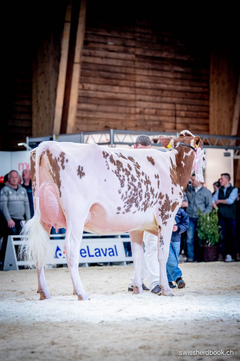 Swissbec POWER-RED is one of the most used bulls in Switzerland for already a long time (see statistics Swiss Herdbook, February 2022). He is bred by the Swissbec breeders syndicate and sold in 2016 through Diamond Genetics France to Qnetics. This beautiful red-and-white bull already stood out because of extremely high genomic breeding values for conformation and especially udders (+131 Udders). Power-Red is still the #5 RZG R&W daughter proven bull at +139 RZG with +126 RZE. Meanwhile, his daughters capture high positions on various shows, like last weekend at the Expo Bulle, Swiss National Show. One of the highlights at the Swiss National Show were for example: Hellender Power Baileys, Scierne-Yaux Power Sauterelle and several more daughters capture top placings at the show.