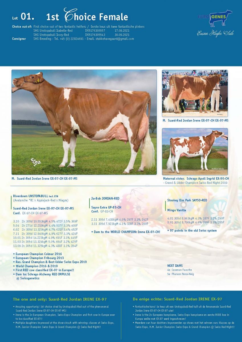 It is sadly to hear that a legend passed away: Suard-Red Jordan Irene EX-97-CH EX-97-MS. The stunning Jordan-Red daughter was a special cow for the Swiss team during the European Show in Fribourg 2013 and Colmar 2016, were she became Grand Champion R&W, two times! She won multiple titels more like, Res. Grand Champion & Best Udder Swiss Expo 2019, World Champion 2016 & 2019 and she is de first RED cow in EUROPE classified with EX-97-CH with EX-97 for her Mammary System!!! Irene her legacy continues with Schrago MrBurns Iris *RC EX-94-CH, Schrago Italia Indiana Red EX-93-CH, Schrago Remedy Ilora Red EX-91-CH, Schrago Acme Indienne *RC EX-90-CH and a Unstopabull-Red heifer that could be yours! In the Easter Heifer Sale, which start this Friday, 15. April 2022 at 06.00 uur (Dutch time), sells Lot 1. A first choice out of a Unstopabull-Red female calf straight out of the legend herself: Suard-Red Jordan Irene EX-97-CH EX-97-MS. Don't miss this!
