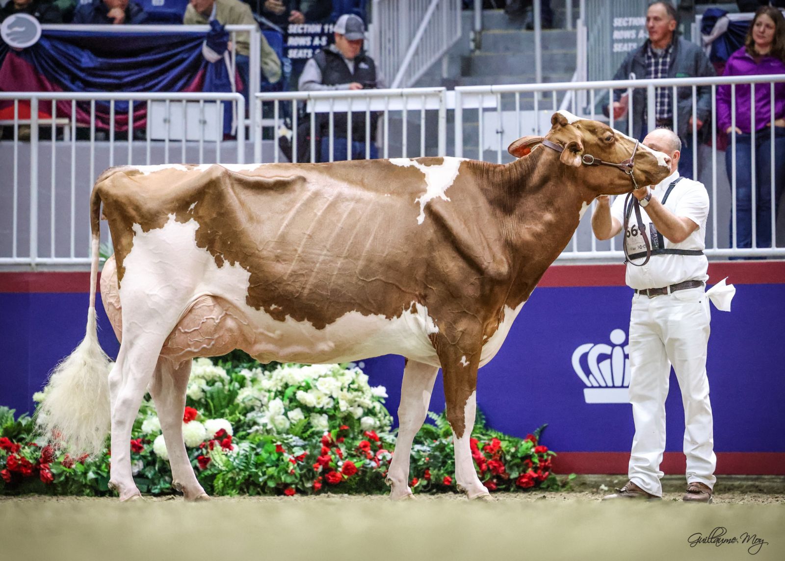 Sadly to hear that a legend has passed away: Blondin Unstopabull Maple-Red EX-94-USA 4yr.! The red & white Unstopabull daughter made a great debut last year at the shows with winning the Intermediate Champion title at the World Dairy Expo 2022 between the black & whites! One month later she became Intermediate Champion R&W and Grand Champion R&W at the Royal Winter Fair 2022! One day later she entered the ring between the black&whites at the Royal Winter Fair and became again Intermediate Champion and Grand Champion B&W! In 2021 she became Grand Champion and Intermediate Champion at the Canadian National R&W Show and was Honorable Mention Intermediate Champion at the Canadian National Black & White show 2021. Blondin Unstopabull Maple-Red EX-94 is the full sister to Auchensala Unstopabull Mojito-Red! Mojito-Red is owned by Hullcrest Holsteins and was 1st in her class and at the last 6 in the finals at the HHH-show! She is open and ready to flush!