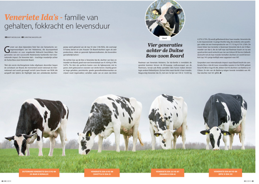 In last month's Holstein International issue was an interesting article written about the longevity and phenomenal breeding power of Butemare Veneriete Ida O VG-86-NL (s. O-Man). This extraordinary cow is the foundation cow behind the popular daughter proven sire Veneriete BOARD // +146 RZG @ RUW, Germany. To make this family extra special: four generations Ida's were photographed at Veneriete Holsteins. Including the youngest one of the four: Veneriete Ida 66 VG-88-NL - the dam to BOARD! For Jan-Anne & Jan Roetman of Veneriete Holsteins are the Ida's the perfect cows in the barn which are not to tall, very balanced and with very good feed and legs. This Dutch cow family is increasing it's fame around the globe and brings it's next topper with a All-Star daughter in Germany testing +161 RZG.