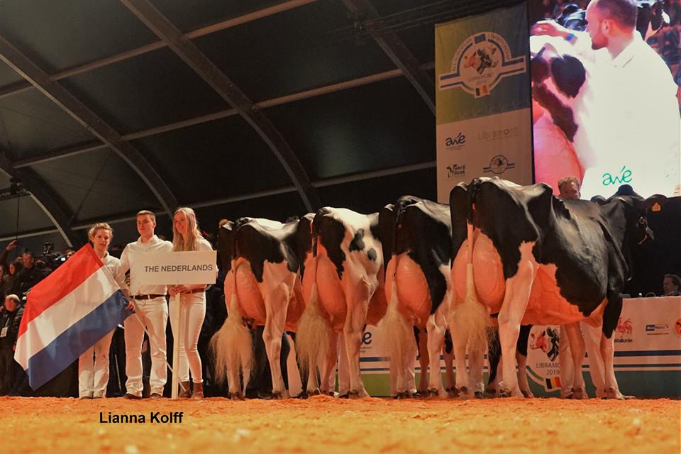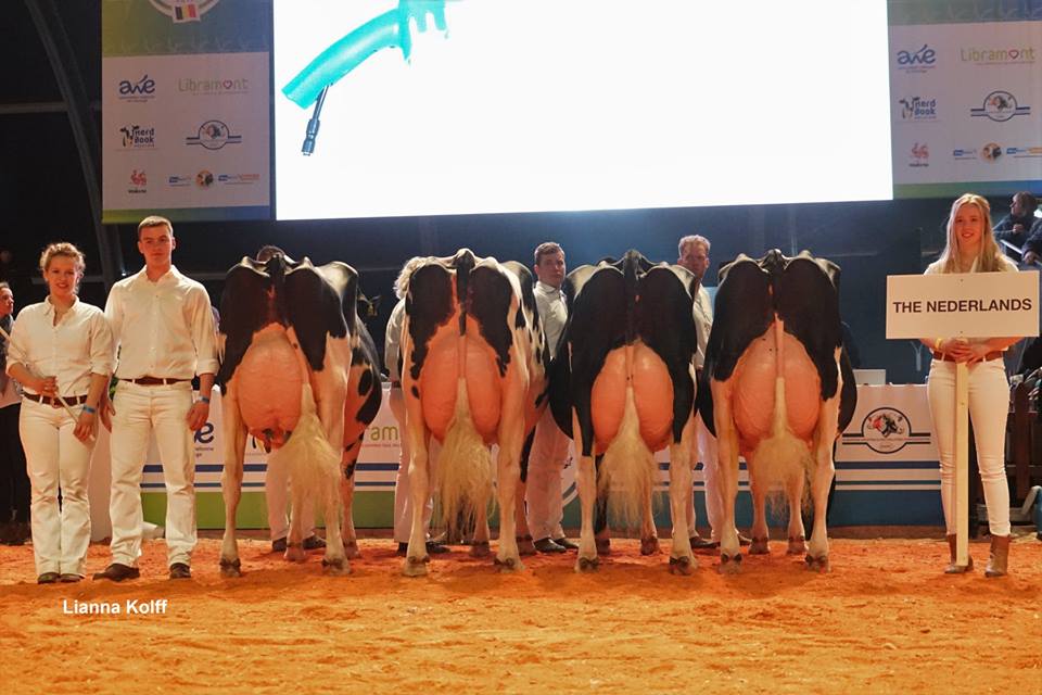 The Country Groups were very successful for the Netherlands with winning the 3rd place in the competion! This incredible group of 4 cows was presented by Bons-Holsteins Koba 219, JK DG Esmeralda, Drakkar Bulona and Bons-Holsteins Ella 192. This youthful group showed incredible mammary systems with many strenght. The 8 judges point out the Netherlands above Italy, Spain, Belgium, Luxembourg and Czech Republic. The gold medal at the Country Groups was for Switzerland and the second place for the great group of France.