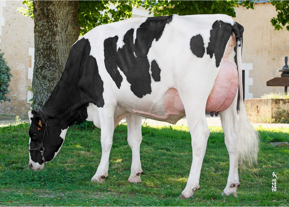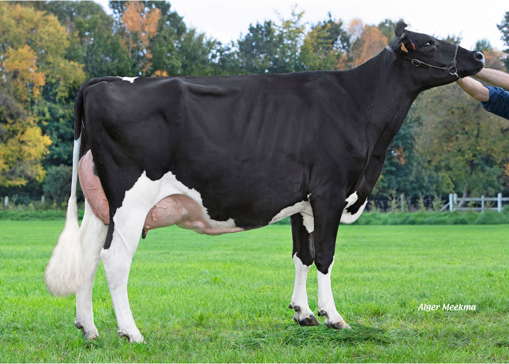 The Sunnylodge Prelude Spottie VG-87-CAN family delivers AGAIN! This family has delivered top sons and grand sons into AI and delivers tremendous daughters all over the World! At Genes Diffusion is DKR Badboy, bred by Drakkar Holsteins, doing a great job. He is a Parfect son at +3027 GTPI in combination with +2.60 PTAT! He guarantees huge milkproduction traits with +1629kgM, +0.13% Fat, +0.06% Protein and a balanced TYPE with +1.25 Stature, +1.60 Strength, +1.23 Body Depth, +3.08 Rear Udder Width and +2.81 Rear Udder Height with a longer Teat Length with +1.08! His dam is Adaway daughter DKR Badaway followed by King Doc daughter Babydoc VG-87-FR from DKR Babydoll VG-86-FR (s. Monterey) and goes back on Shottle daughter Baviere VG-87-FR EX-90-MS!