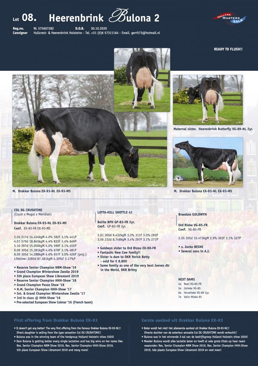 SET OFF YOUR SIGHTS.... The very first offering from the outstanding Drakkar Bulona EX-93-NL!! Her Col DG CRUSHTIME daughters sells in the Online Holland Masters Sale next July 9th!! Drakkar Bulona has recently raised her score to EX-93 in her 5th lactation with >87.000 kg milk lifetime production. BULONA was bred by Diamond Genetics France / Drakkar Holsteins and sold through the Vente Drakkar to Heerenbrink Holsteins in the Netherlands where later on Hullcrest Holsteins joined ownership. Bulona has a huge victorylist, including multiple Grand Championships and as well was a successful participant for The Netherlands at the European Championship in Libramont '19. Bulona comes from the great Ord Rieke cow family and she already has a maximum scored daughter, Heerenbrink Butterfly VG-89-NL La1. (s. Atwood). Don't miss out this rare and special opportunity, and bid last on July 9th!!