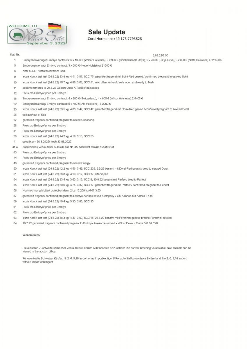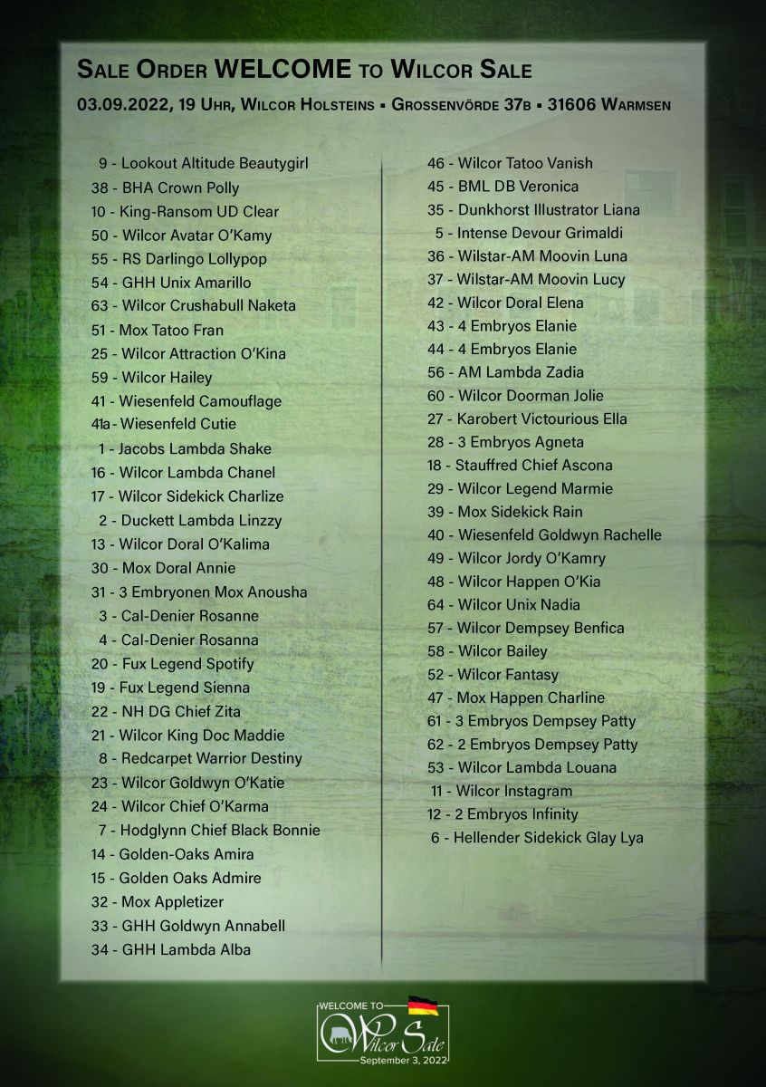 TONIGHT IS THE NIGHT! The Welcome to Wilcor Sale '22 starts tonight at 07.00 P.M. (German Time) at Wilcor Holsteins, Warmsen (DE). The Sale order and Sale Update are now online available! The best holsteins WORLDWIDE sells tonight with for example: the only Delta-Lambda daughter in Europe from Erbacres Snapple Shakira EX-97-CAN, the stunning Altitude-Red daughter out of Garay Awesome BEAUTY VG-88-USA 2yr. CAN and many more! If you can't make it to the sale, you can follow the sale through www.genetics-sale.ch.
