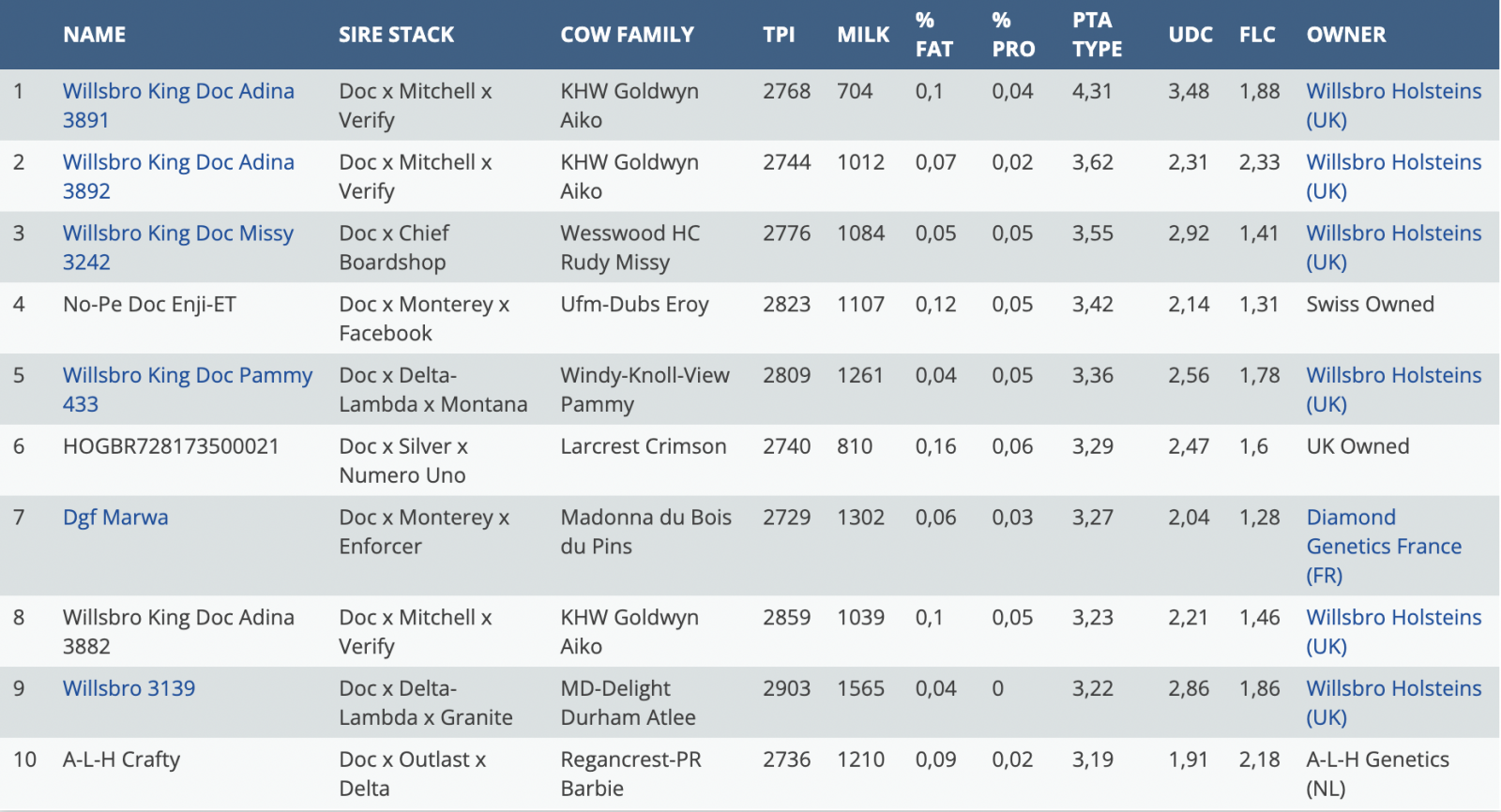Today we'll introduce you a new top 10 PTAT Woodcrest KING DOC daughters in Europe with all above +2736 GTPI. Topping the list is Willsbro King Doc Adina 3891 at +4.31 PTAT in combination with +2768 GTPI. She is a King Doc daughter out of the fresh Mitchell daughter Willsbro Mitchell Adina 50. On the second spot we find Adina 3891 her full sister Willsbro King Doc Adina 3892 at +3.62 PTAT and +2744 GTPI. Furthermore at the 3rd spot we find Willsbro King Doc Missy 3242 at +3.55 PTAT with +2776 GTPI. She is King Doc daughter out of Willsbro Chief Missy 68 VG-85-UK and backed by Wesswood-HC Rudy Missy EX-92-USA 3E GMD DOM.