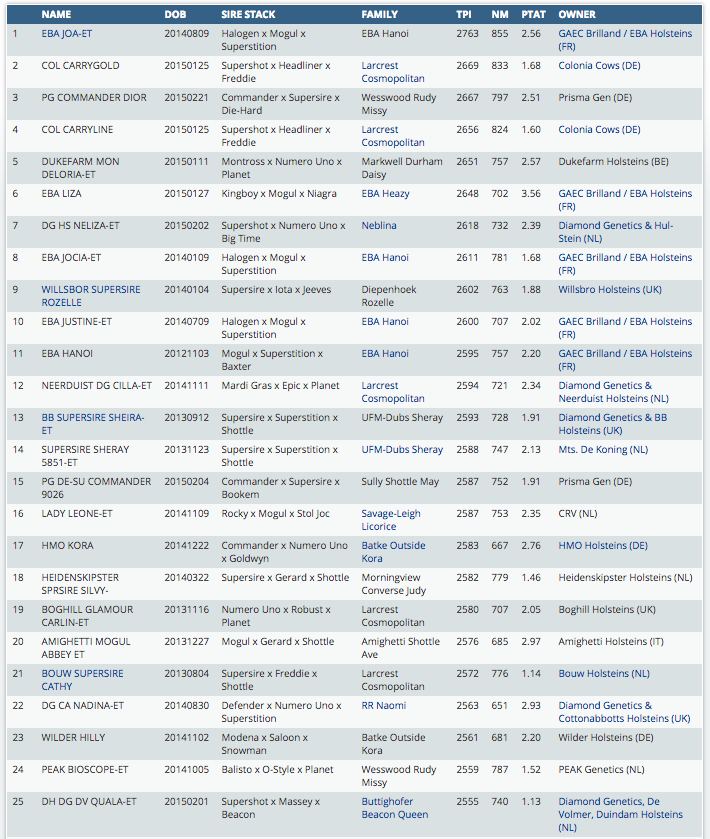 EBA Joa keeps the #1 position in the European GTPI ranking with a GTPI +2763! She is one out of 8 members of the EBA Hanoi cow family in the European GTPI Top 100. Another dominant donor is Col Carmen of Colonia Cows, a Headliner grand dtr of Larcrest Cosmopolitan, her Supershot dtr Col Carrygold is the #2 GTPI heifer in Europe with GTPI +2669, she has 3 more sisters and still her dam in the European GTPI Top 100. Click further for the complete ranking.