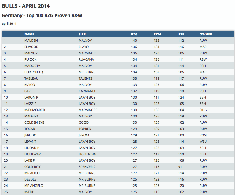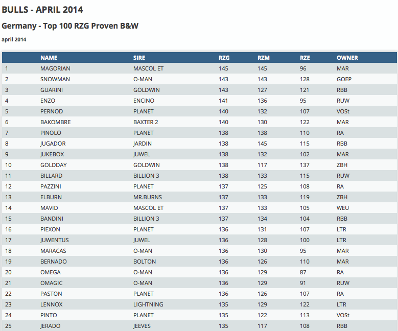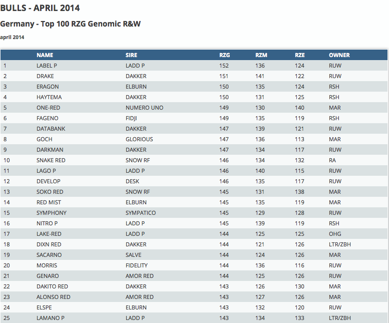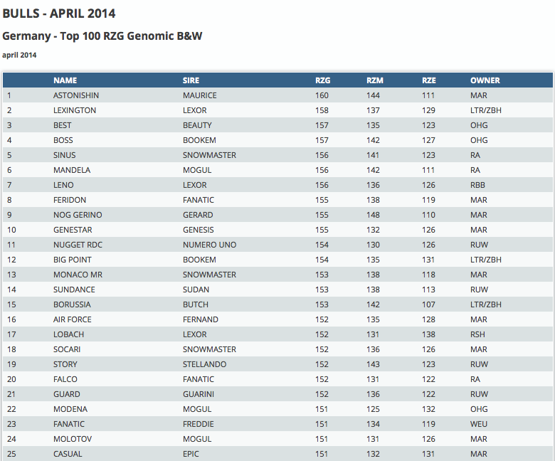 Click further for the top 100 RZG bulls for Black & White and Red & White! Due to a change in the German breeding value calculation is Astonishin sired by Maurice the leader of the black & white genomic bulls with RZG +160. He is followed by the early Lexor son Lexington with RZG +158! The red & polled Ladd P son, Label *P keep his #1 position of the red & white genomic bulls with RZG +152.