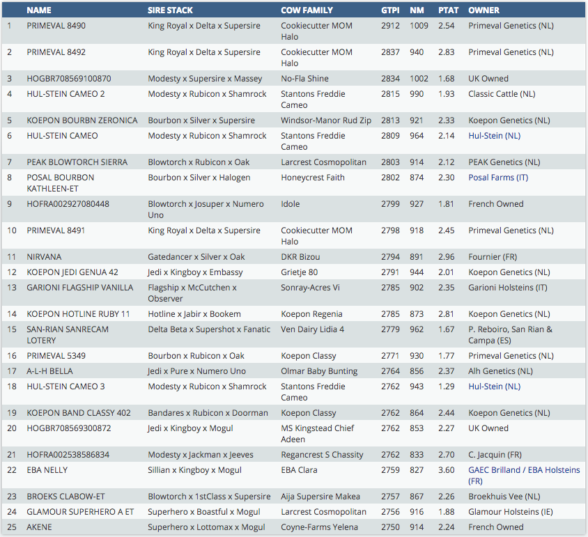 The new #1 GTPI heifer in Europe is a King Royal dtr (Primeval 9490) with GTPI +2912, followed by her full sister Primeval 8492. The recently sold (German Masters Sale '17) Hul-Stein Cameo 2 is the #4 GTPI heifer in this list with GTPI +2815 / NM $ 990 - she is currently owned by Classic Cattle, her full sister Cameo is the #6 GTPI heifer this month. Posal Farms from Italy are having a very high Bourbon daughter, Posal Bourbon Kathleen with GTPI +2802! Click further for the complete Top 25.