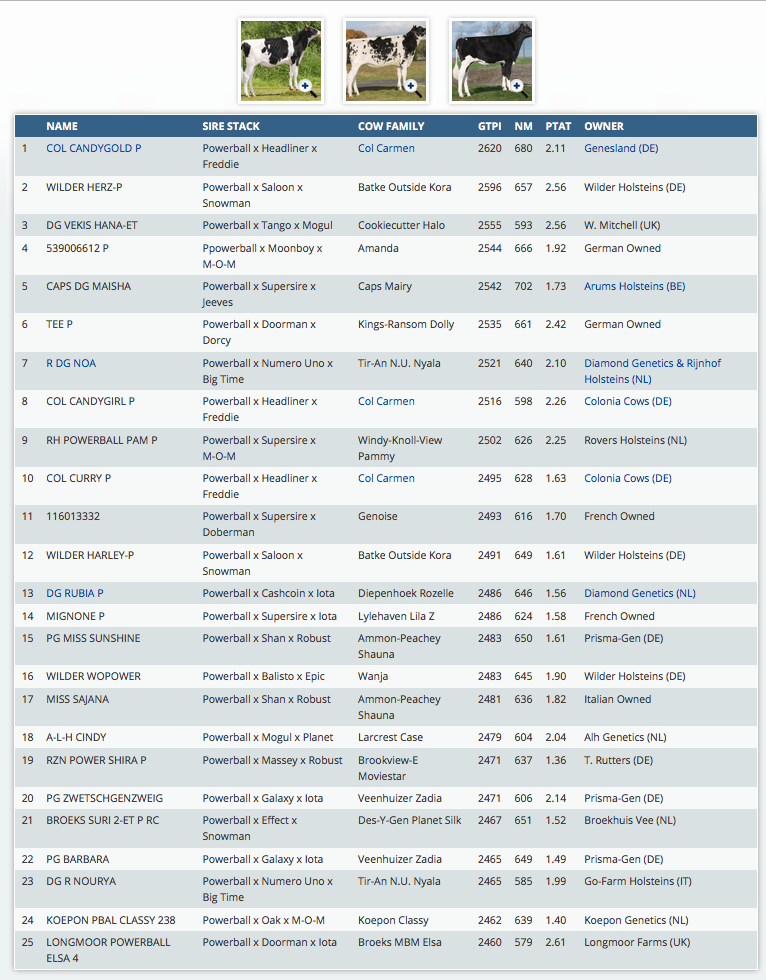 View-Home Powerball P was one of the most inluantial Polled bulls of the recent generation, when he had first semen available he was on top of the GTPI Polled ranking and has been used since his high numbers in multiple different systems. He is the foundation behind many of the top ranking Polled bulls and heifers right now. Check further for his 25 highest GTPI daughters from Europe! His highest daughter in Europe is as well the #2 GTPI POLLED Powerball daughter in the breed!