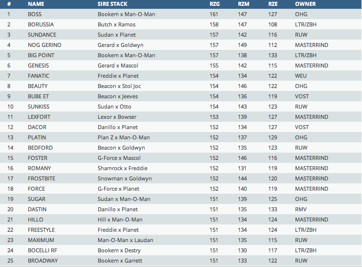 Click further to for the top 25 RZG genomic bulls of Germany! Boss is leading with +161 RZG! He is from the great Man-O-Man-daughter, KNS Rendezvous going back on the Radieuse family!