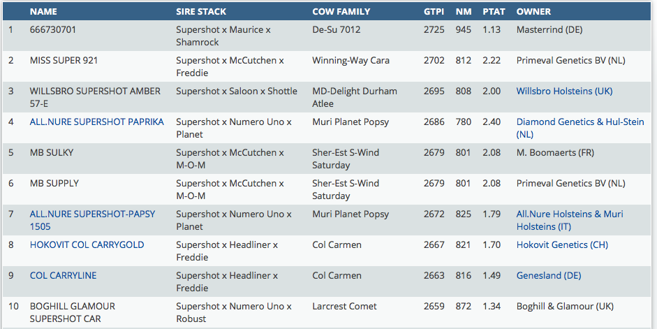 2017 will be a very exciting year for Cogent Supershot, Supershot was bred by Diamond Genetics & De Volmer Holsteins from the Netherlands. His first daughters are milking in multiple countries all around the World with a great satisfaction from their owners. Supershot daughters are very productive, healthy and the first daughters already were scoring VG as 2yr. olds in, for example, Stantons Holsteins from Canada had 4 Supershot daughters scoring VG 2yr. old in Canada already! Europe has many interesting Supershot females, click further for his 40 highest daughters for GTPI in Europe!