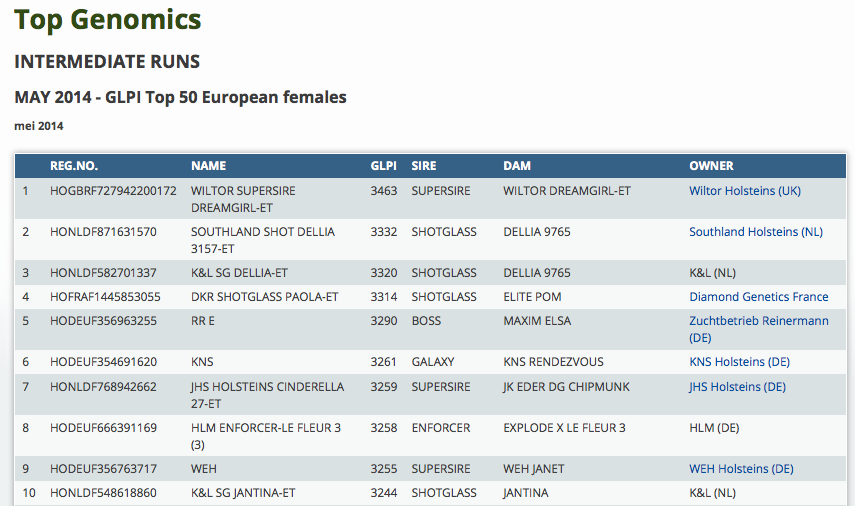 It's index day! Find here the Top 50 for European test females, based on GLPI from the May 2014 run!
