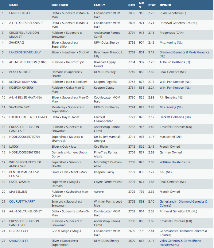 The Top 50 GTPI European Females are online! #1 GTPI Heifer in the Europe is CNN Hi-Lite-Et (owned by Peak Genetics) with GTPI 2835, followed by A-L-H Delta Helania with GTPI 2803 (owned by Primeval Genetics B.V.) & Crossfell Rubicon Mila (owned by Progensis, Canada) which was sold through the Vekis Spring Sale! Click further for the complete Top 50 GTPI European Females (08/16).
